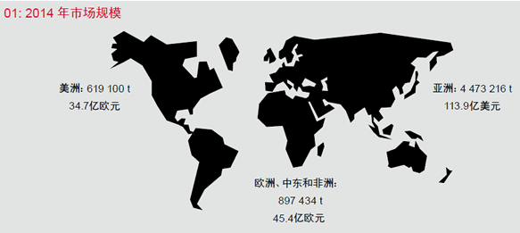 2014年市場規模,美洲:619100t,34.7億歐元;歐洲、中東和非洲:897434t,45.4億歐元;亞洲:4473216t,113.9億美元。