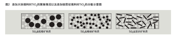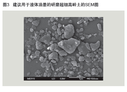 因此,當PVC為30%時,降低鈦白粉用量,配制白色液體油 墨,獲得總體不透明度最佳還是有可能的。該方法已成功應用于 高光/半光涂料,適當降低PVC含量,使用礦物填料優化鈦白粉含量和不透明性(舉例參見文獻[5-8])。據報道,與粗顆粒和塊狀顆 粒相比,具有層狀結構的細礦物顆粒(如高嶺土)更加有效,具 體效果見圖2所示,這種層狀顆??筛纳撇煌该鞫鹊脑蛟谟赥iO2 聚集體[9]較少,TiO2顆粒的吸收和粗糙效果[8]和TiO2顆粒可能被間 隔,不過文獻中對所述效果仍存在不同觀點[10]。因此,本研究重 點是使用超細高嶺土優化高TiO2含量的水性柔版印刷油墨配方,旨 在保持光澤和不透明度不變。