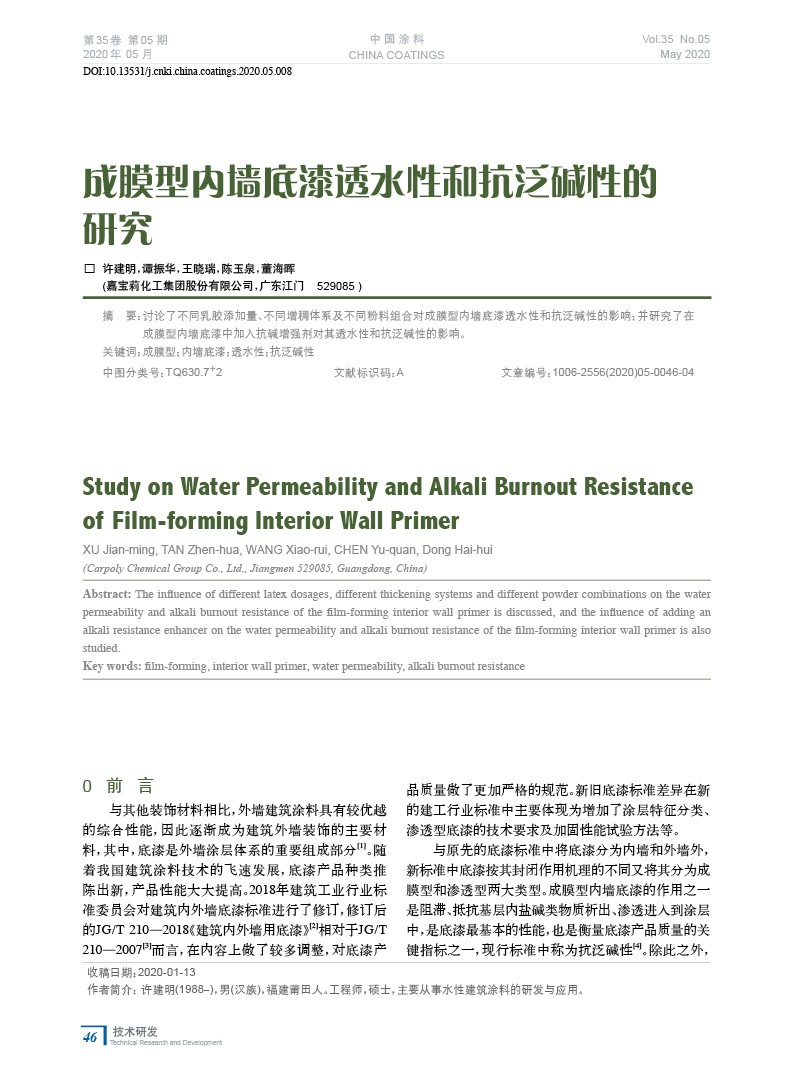 成膜型內(nèi)墻底漆透水性和抗泛堿性的研究