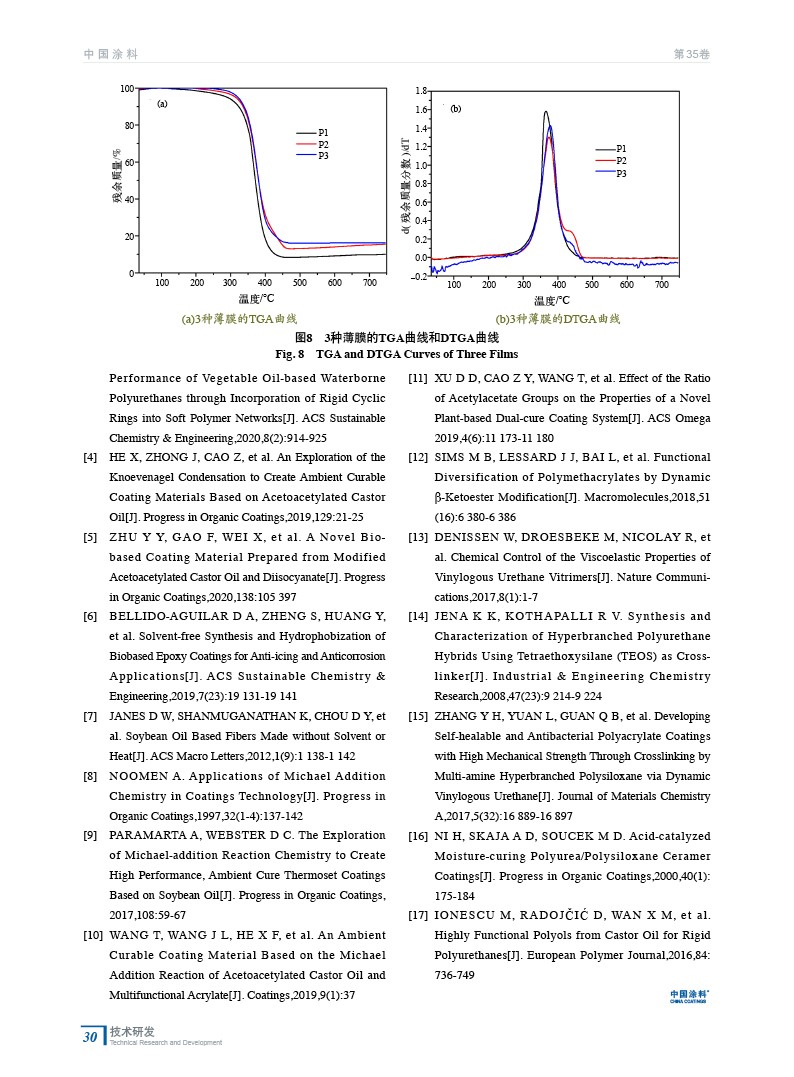摘要:介紹了一種無溶劑法制備菜籽油基邁克爾加成涂層,以菜籽油、2–巰基乙醇、乙酰乙酸叔丁酯為原料,通過巰基“點擊”反應(yīng)和酯交換反應(yīng)制備乙酰乙酸酯菜籽油,并和多官能度丙烯酸酯反應(yīng)(Michael加成反應(yīng))制備涂層。通過動態(tài)熱機械分析、熱重力分析和差分掃描熱量法,對所得涂層的機械性能和熱力學(xué)性能進(jìn)行研究。結(jié)果表明,隨著涂層交聯(lián)密度的增加,涂層的機械性能、熱穩(wěn)定性增加。