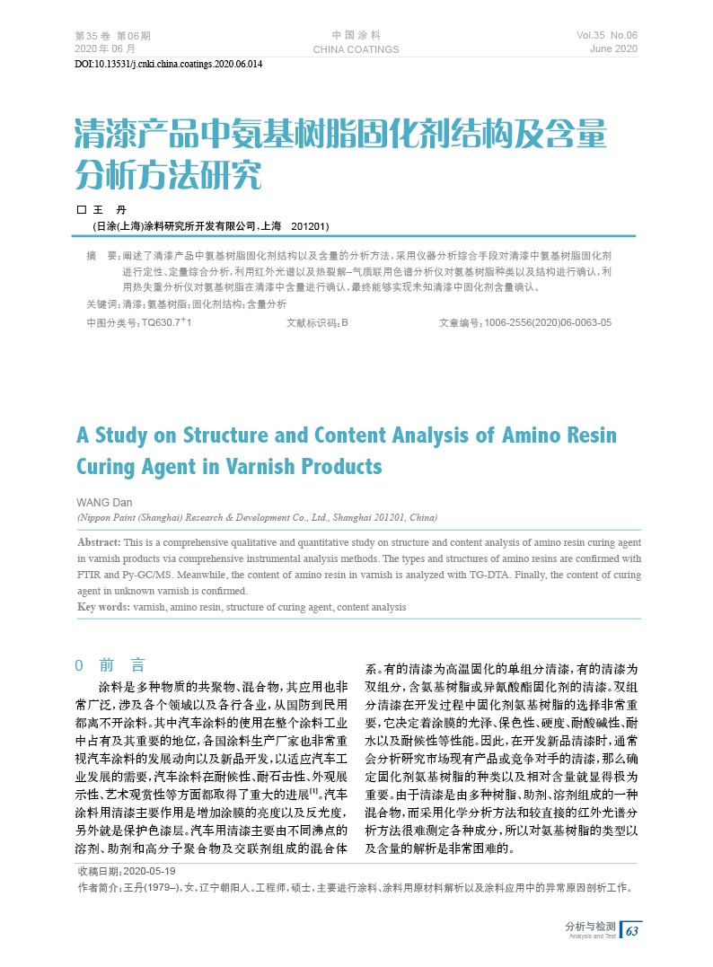 摘要:闡述了清漆產品中氨基樹脂固化劑結構以及含量的分析方法,采用儀器分析綜合手段對清漆中氨基樹脂固化劑進行定性、定量綜合分析,利用紅外光譜以及熱裂解–氣質聯用色譜分析儀對氨基樹脂種類以及結構進行確認,利用熱失重分析儀對氨基樹脂在清漆中含量進行確認,最終能夠實現未知清漆中固化劑含量確認。