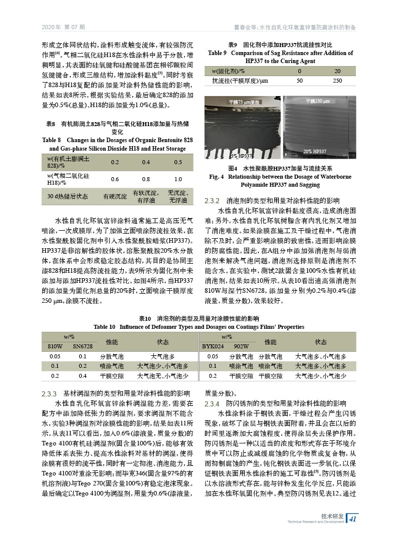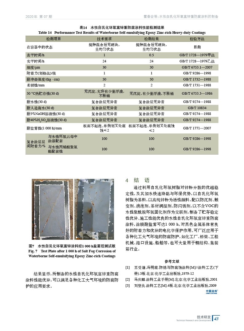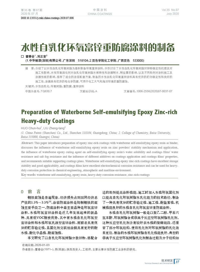 摘要:介紹了以水性自乳化環氧樹脂為基料制備環氧富鋅涂料,分別討論了水性自乳化環氧樹脂對鋅粉穩定性機理及對施工性影響、水性環氧固化劑對自乳化環氧樹脂水稀釋性和涂膜耐水、耐鹽霧的影響,以及不同助劑對涂料施工及涂膜性能的影響,推薦了適合的涂層配套方案。制備的水性自乳化環氧富鋅涂料具有優異的貯存穩定性和良好的施工性,涂膜具有優異的電化學防腐,可用于化工大氣和海洋環境的重防腐蝕。