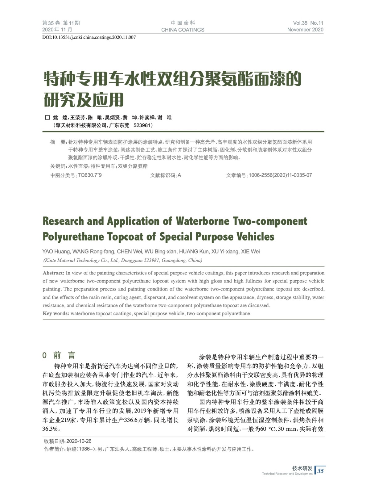 特種專用車水性雙組分聚氨酯面漆的研究及應用