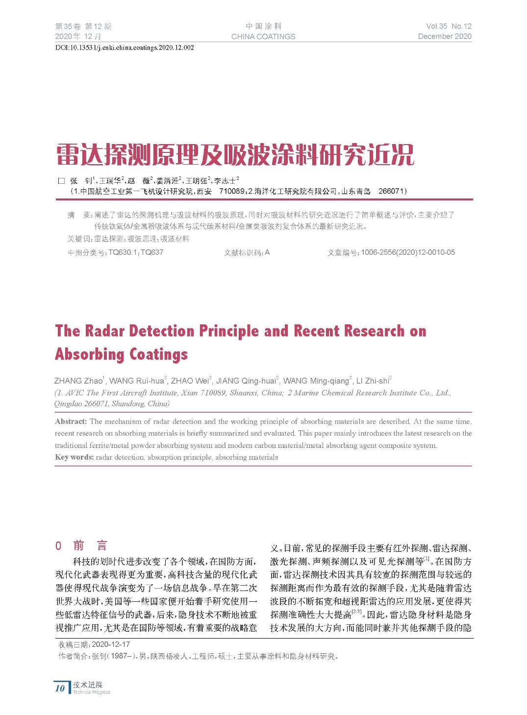 闡述了雷達的探測機理與吸波材料的吸波原理,同時對吸波材料的研究近況進行了簡單概述與評價,主要介紹了傳統(tǒng)鐵氧體/金屬粉吸波體系與現(xiàn)代碳系材料/金屬類吸波劑復合體系的最新研究近況。