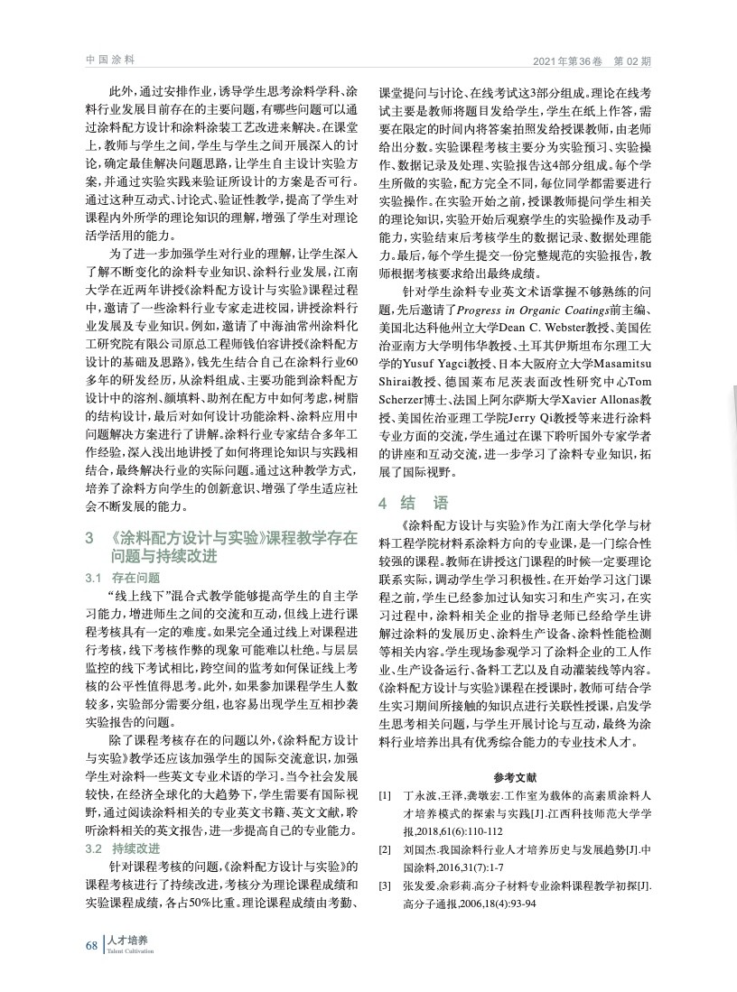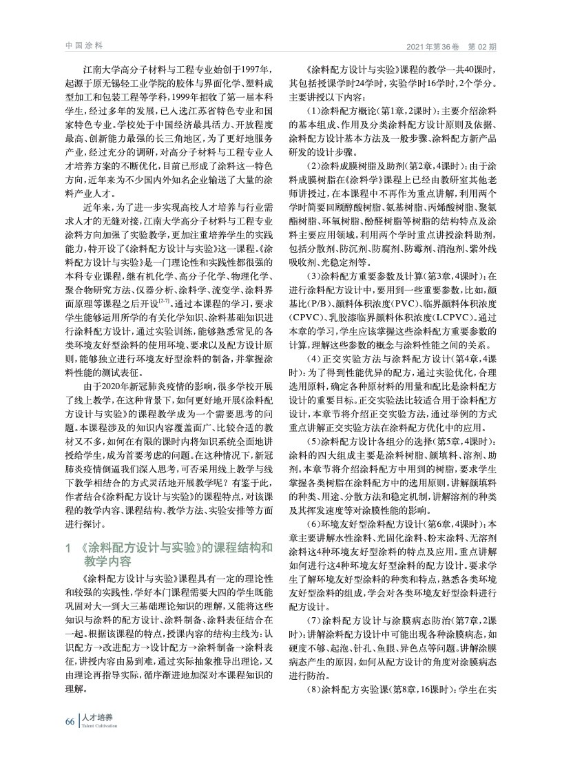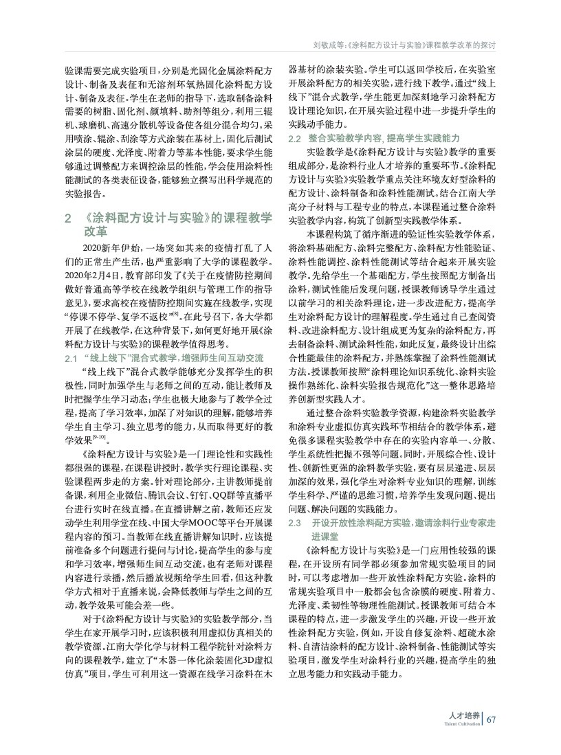 摘要:分析了《涂料配方設(shè)計(jì)與實(shí)驗(yàn)》這門課程的特點(diǎn)及存在的問題,以提高課程教學(xué)質(zhì)量為主要目標(biāo),探討新冠疫情背景下引入新的教學(xué)模式,如采用“線上線下”混合式教學(xué),并優(yōu)化課程的教學(xué)內(nèi)容和考核方式,為涂料行業(yè)培養(yǎng)更多具有專業(yè)知識和實(shí)踐能力的高素質(zhì)人才。