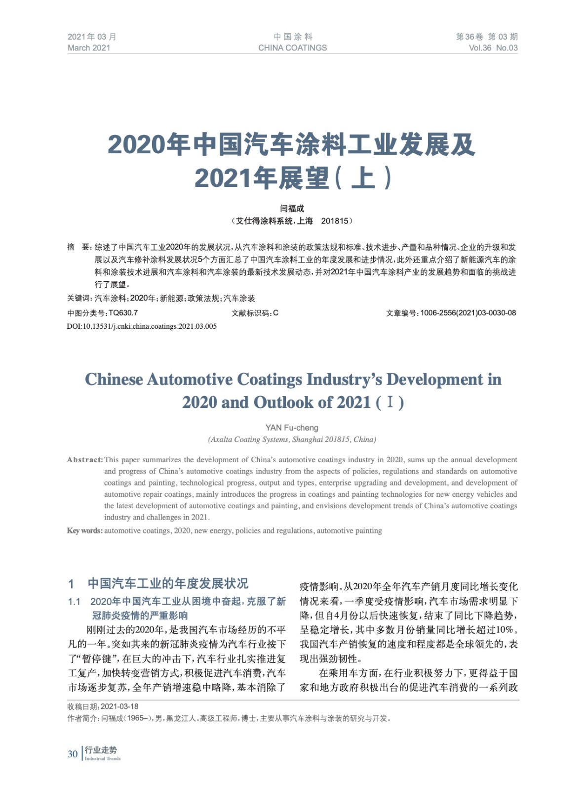 摘要:綜述了中國汽車工業(yè)2020年的發(fā)展?fàn)顩r,從汽車涂料和涂裝的政策法規(guī)和標(biāo)準(zhǔn)、技術(shù)進(jìn)步、產(chǎn)量和品種情況、企業(yè)的升級(jí)和發(fā)展以及汽車修補(bǔ)涂料發(fā)展?fàn)顩r5個(gè)方面匯總了中國汽車涂料工業(yè)的年度發(fā)展和進(jìn)步情況,此外還重點(diǎn)介紹了新能源汽車的涂料和涂裝技術(shù)進(jìn)展和汽車涂料和汽車涂裝的最新技術(shù)發(fā)展動(dòng)態(tài),并對(duì)2021年中國汽車涂料產(chǎn)業(yè)的發(fā)展趨勢和面臨的挑戰(zhàn)進(jìn)行了展望。