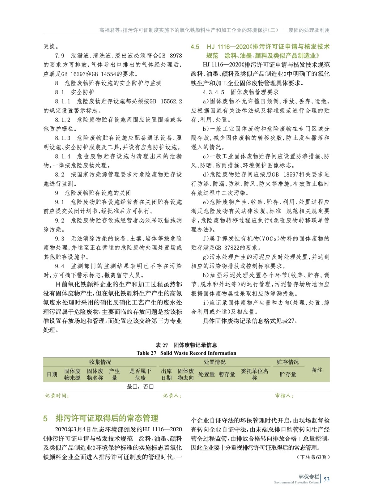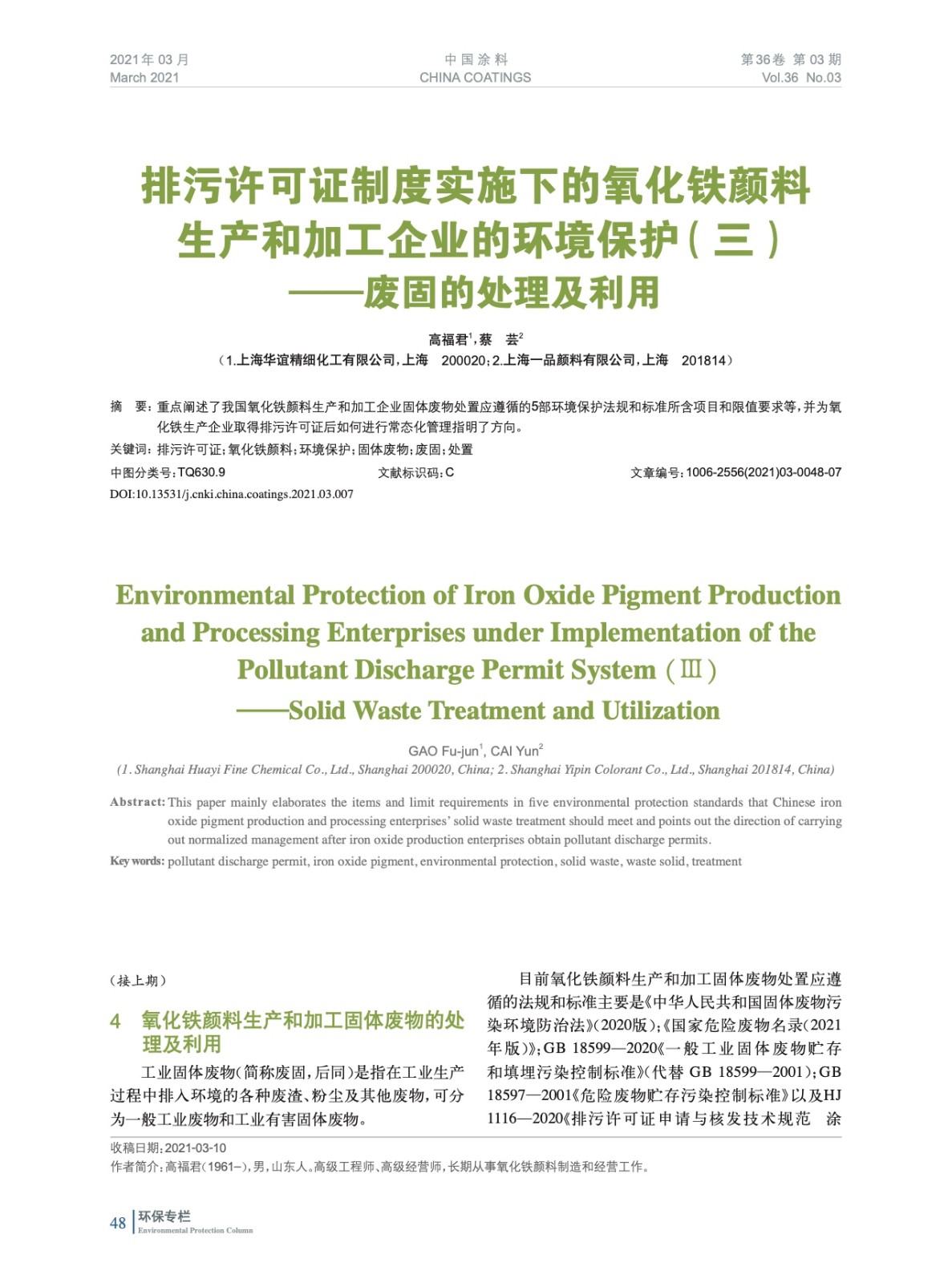 重點闡述了我國氧化鐵顏料生產和加工企業固體廢物處置應遵循的5部環境保護法規和標準所含項目和限值要求等,并為氧化鐵生產企業取得排污許可證后如何進行常態化管理指明了方向。
