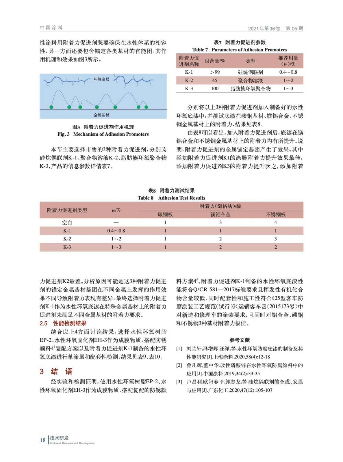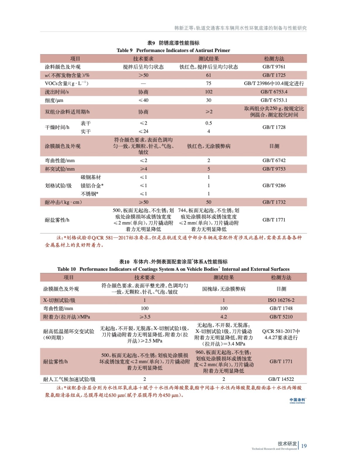 摘要:通過對樹脂、固化劑、防銹顏料和附著力促進劑的篩選,制備了應用于軌道交通客車車輛防腐的水性環(huán)氧底漆。其性能符合Q/CR 581—2017《鐵路客車用涂料技術條件》,該底漆VOCs含量較低,耐鹽霧性佳,具備極佳的環(huán)境友好性能和防腐性能;在碳鋼、不銹鋼、鋁合金3種底材上的附著力極好;與原子灰膩子的配套性極佳,是軌道交通客車配套涂裝應用中VOCs減排、防腐蝕的優(yōu)選產品。
