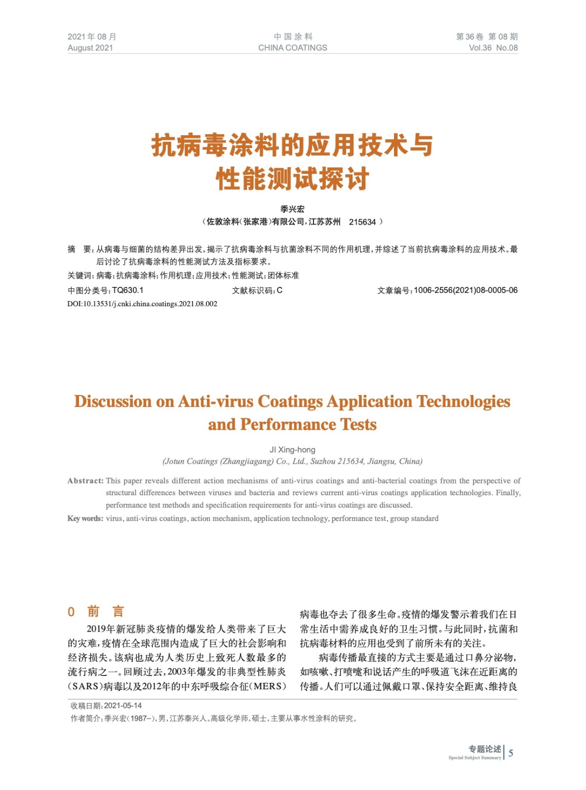 從病毒與細菌的結構差異出發,揭示了抗病毒涂料與抗菌涂料不同的作用機理,并綜述了當前抗病毒涂料的應用技術。最后討論了抗病毒涂料的性能測試方法及指標要求。