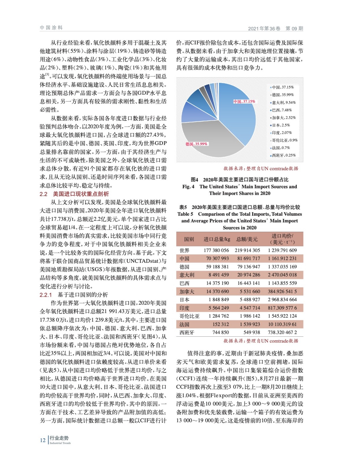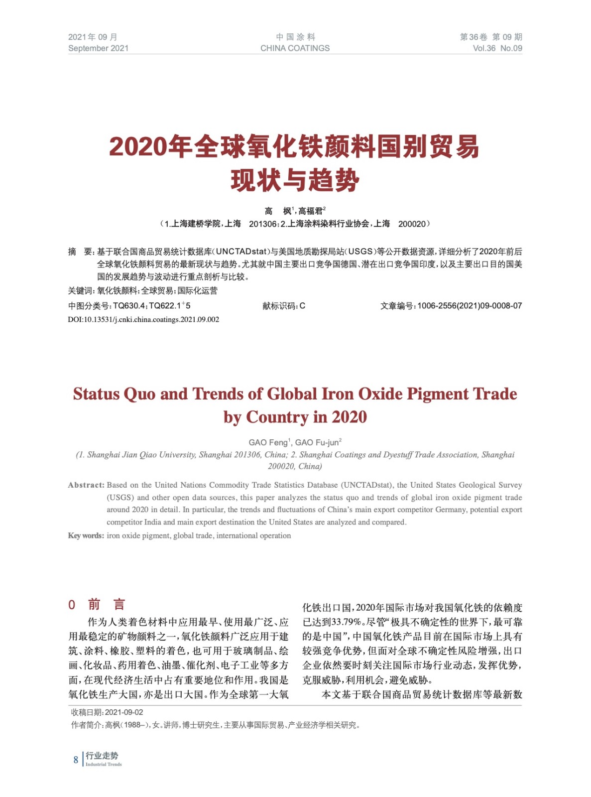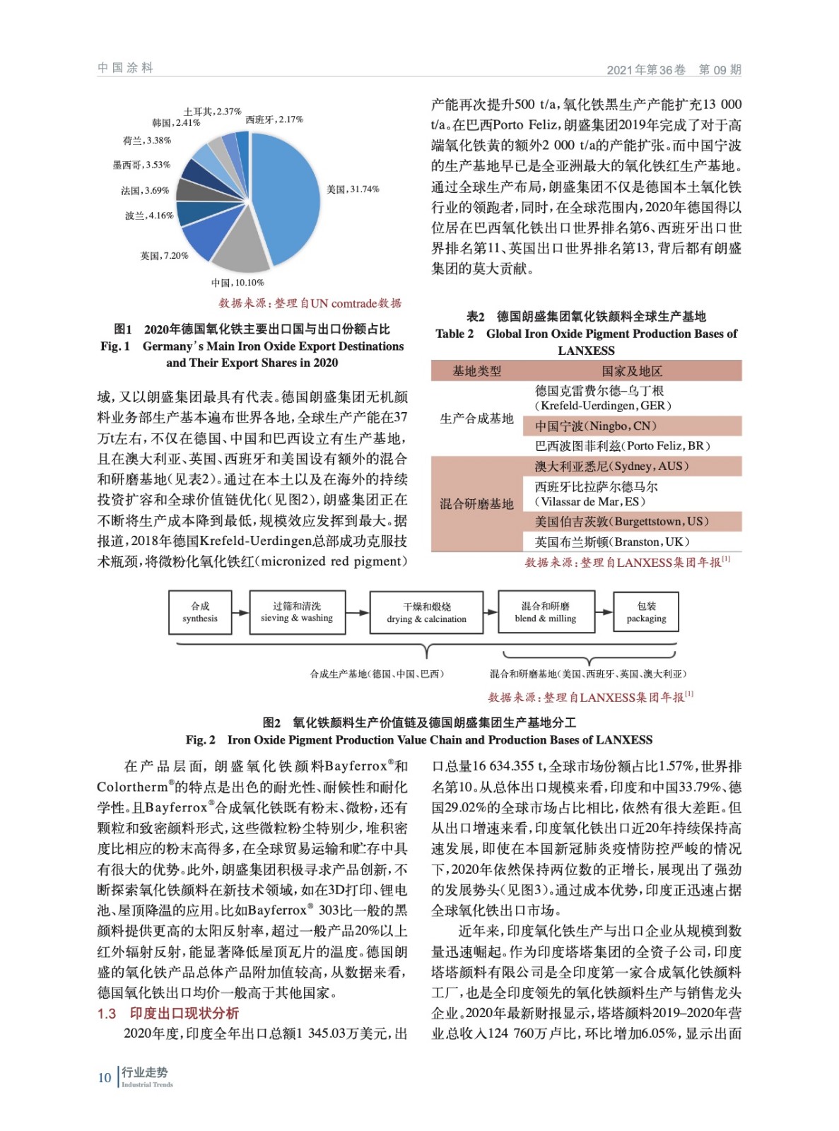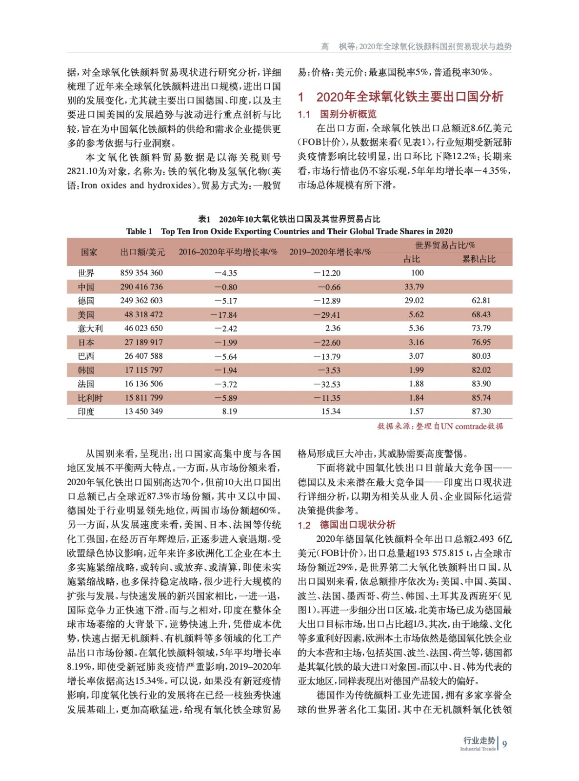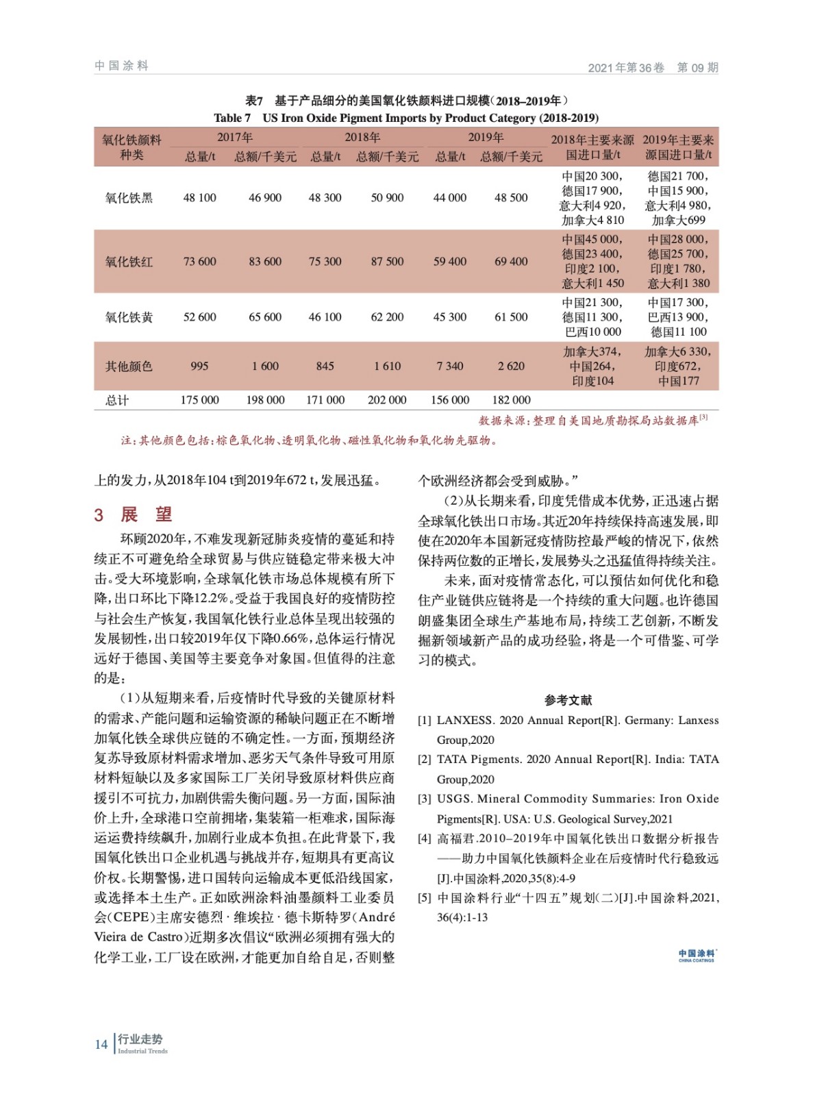 基于聯合國商品貿易統計數據庫(UNCTADstat)與美國地質勘探局站(USGS)等公開數據資源,詳細分析了2020年前后全球氧化鐵顏料貿易的最新現狀與趨勢。尤其就中國主要出口競爭國德國、潛在出口競爭國印度,以及主要出口目的國美國的發展趨勢與波動進行重點剖析與比較。