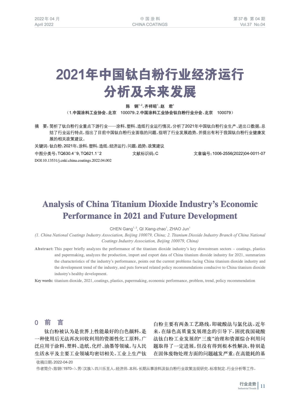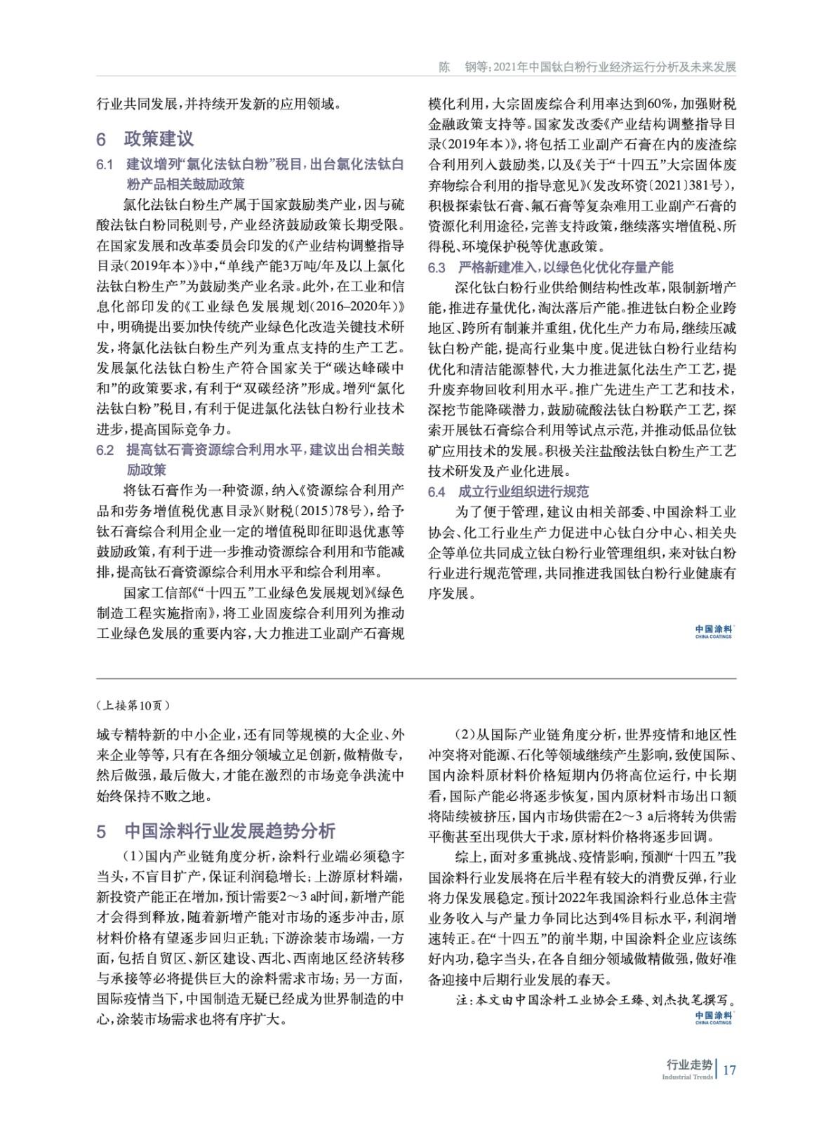 摘要:簡析了鈦白粉行業重點下游行業——涂料、塑料、造紙行業運行情況,分析了2021年中國鈦白粉行業生產、進出口數據,總結了行業運行特點,指出了目前中國鈦白粉行業面臨的問題,指明了行業發展趨勢,并提出有利于我國鈦白粉行業健康發展的相關政策建議。