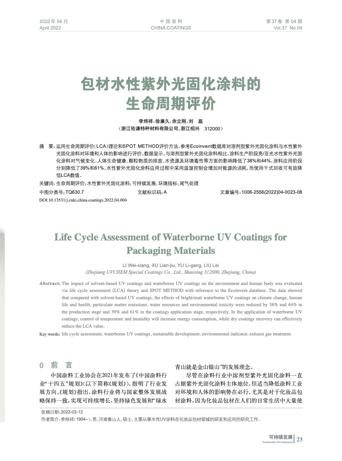 摘要:運用生命周期評價理論和SPOT METHOD評價方法,參考Ecoinvent數據庫對的溶劑型紫外光固化涂料與水性紫外光固化涂料對環境和人體的影響進行評價。數據顯示,與溶劑型紫外光固化涂料相比,涂料生產階段亮/亞光水性紫外光固化涂料對氣候變化、人體生命健康、顆粒物質的排放、水資源及環境毒性等方面的影響降低了38%和44%,涂料應用階段分別降低了39%和61%。