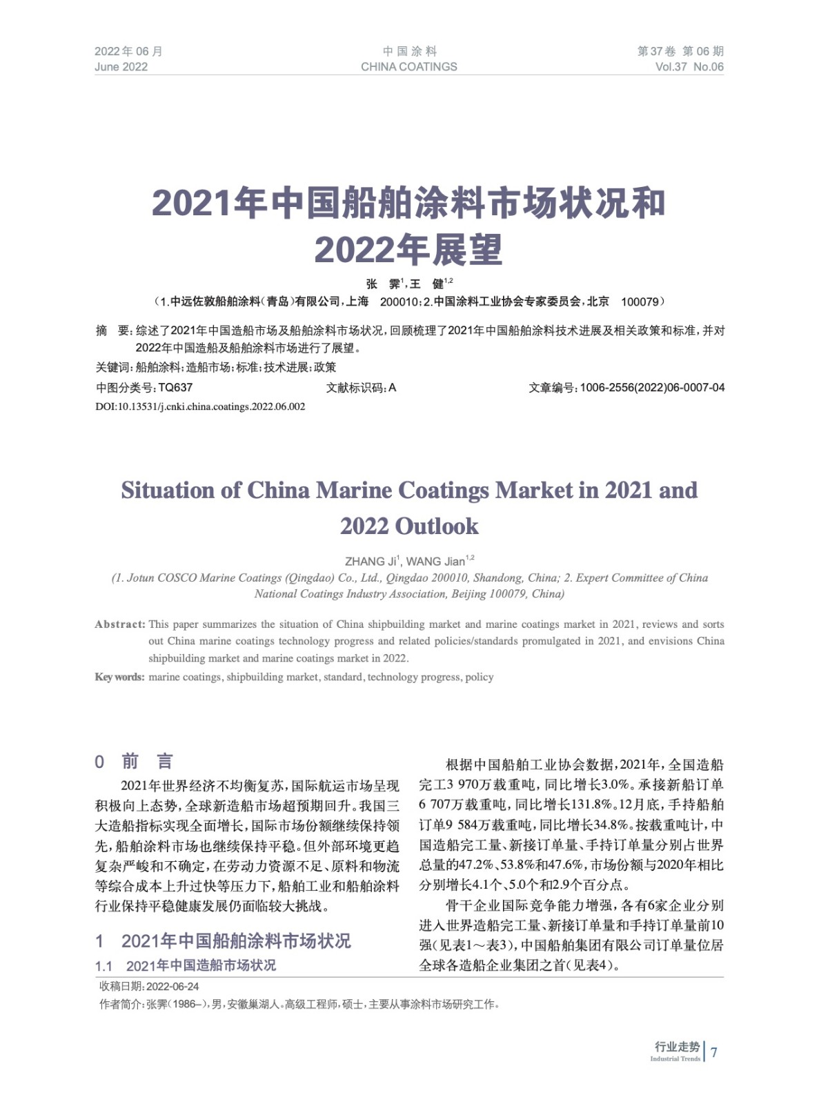 摘要:綜述了2021年中國造船市場及船舶涂料市場狀況,回顧梳理了2021年中國船舶涂料技術進展及相關政策和標準,并對2022年中國造船及船舶涂料市場進行了展望。