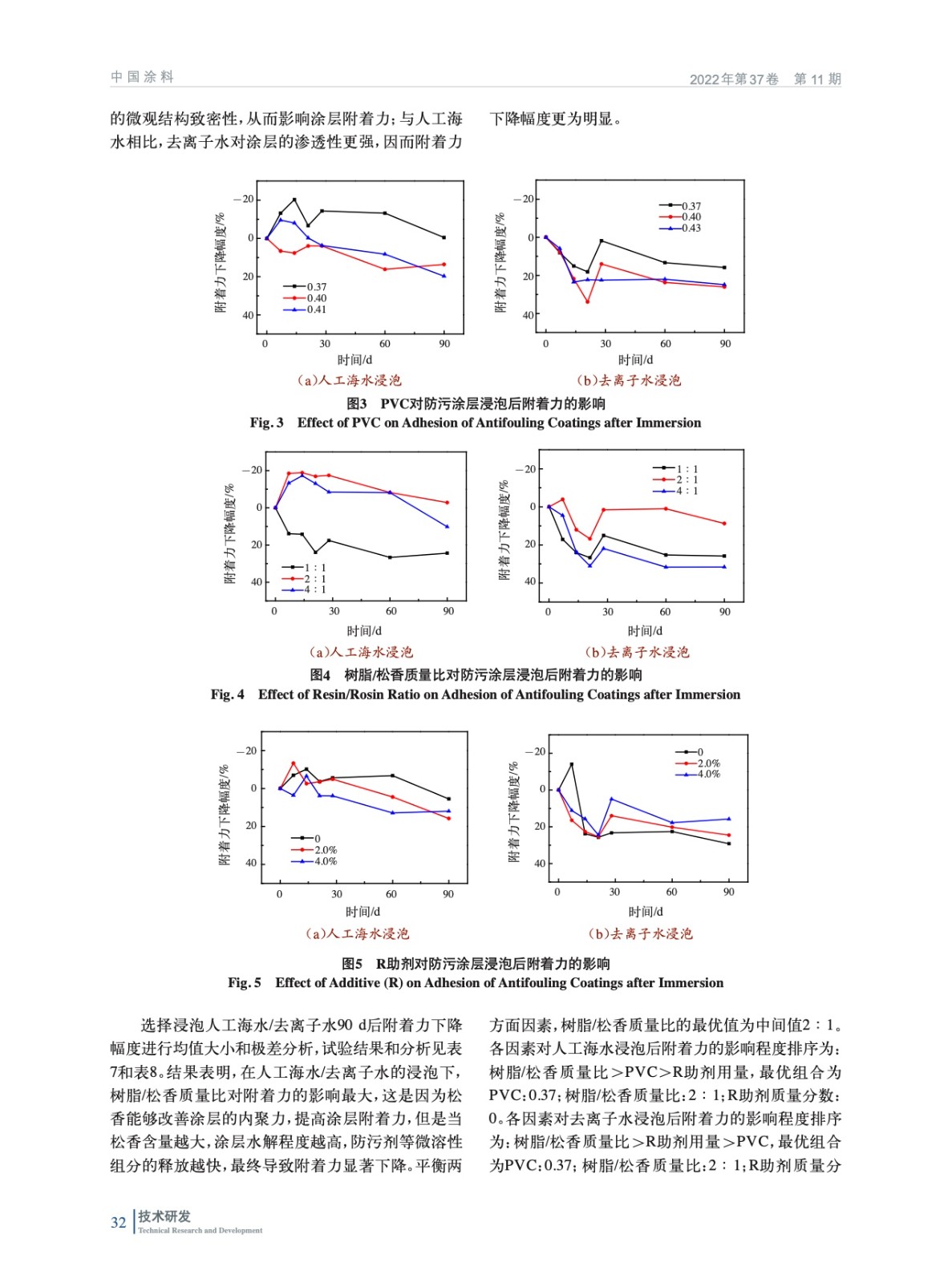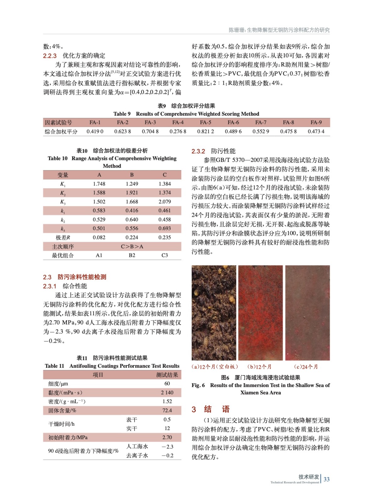 摘要:通過測定樹脂的固含量、黏度和降解性能篩選出綜合性能合適的生物降解型樹脂作為主體樹脂,并以防污效果較好的吡啶硫酮鋅/溴代吡咯腈(ZPT/Econea)復配防污劑作為主防污劑,運用正交試驗設計方法進行無銅防污涂料配方研究。通過淺海掛板試驗和浸泡人工海水/去離子水后涂層附著力的測試,研究顏料體積濃度(PVC)、樹脂/松香質量比和滲出率調節助劑(R助劑)添加量對涂層防污性能和耐浸泡性能的影響,通過綜合加權評分法計算出配方中各因素的最優值和各組分的最優添加量。研究結果表明,當配方中PVC為0.37、樹脂/松香質量比為2∶1、R助劑質量分數為4.0%時,涂層具有良好的耐浸泡性能。經過24個月淺海掛板試驗驗證,涂層具有優異的防污期效。通過正交試驗優化得到的以PU3為主體樹脂的生物降解型無銅防污涂料具有良好的耐浸泡性能和防污效果。