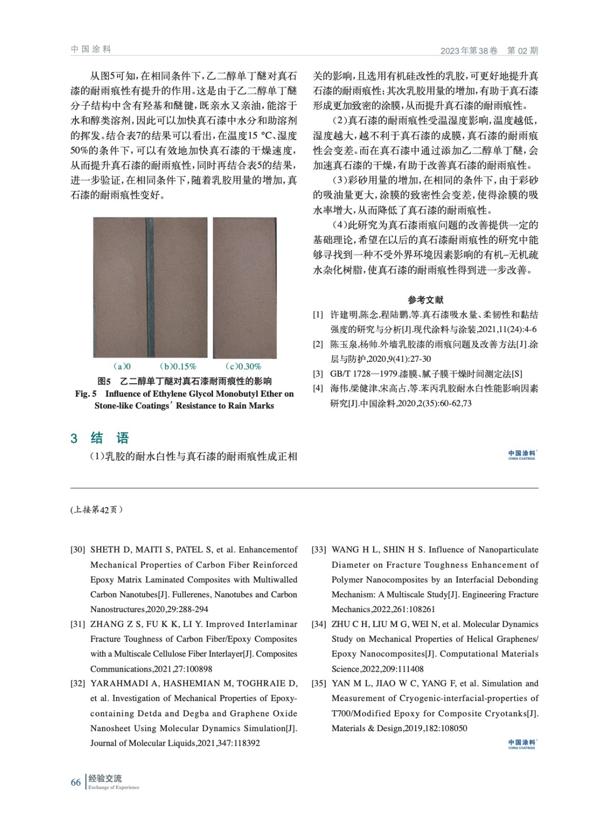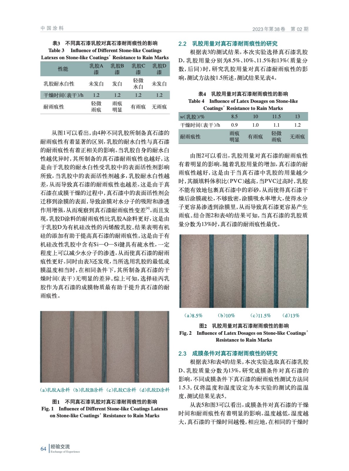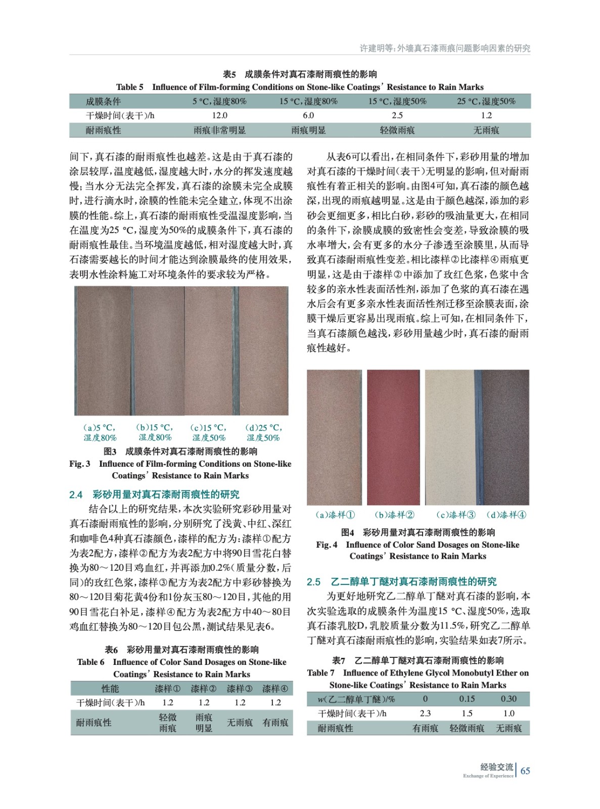 討論了不同真石漆乳膠品種、乳膠用量、成膜條件和彩砂用量對真石漆雨痕的影響,并研究了在真石漆中添加乙二醇單丁醚對真石漆雨痕的影響。