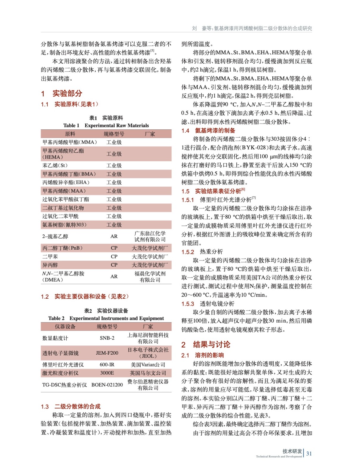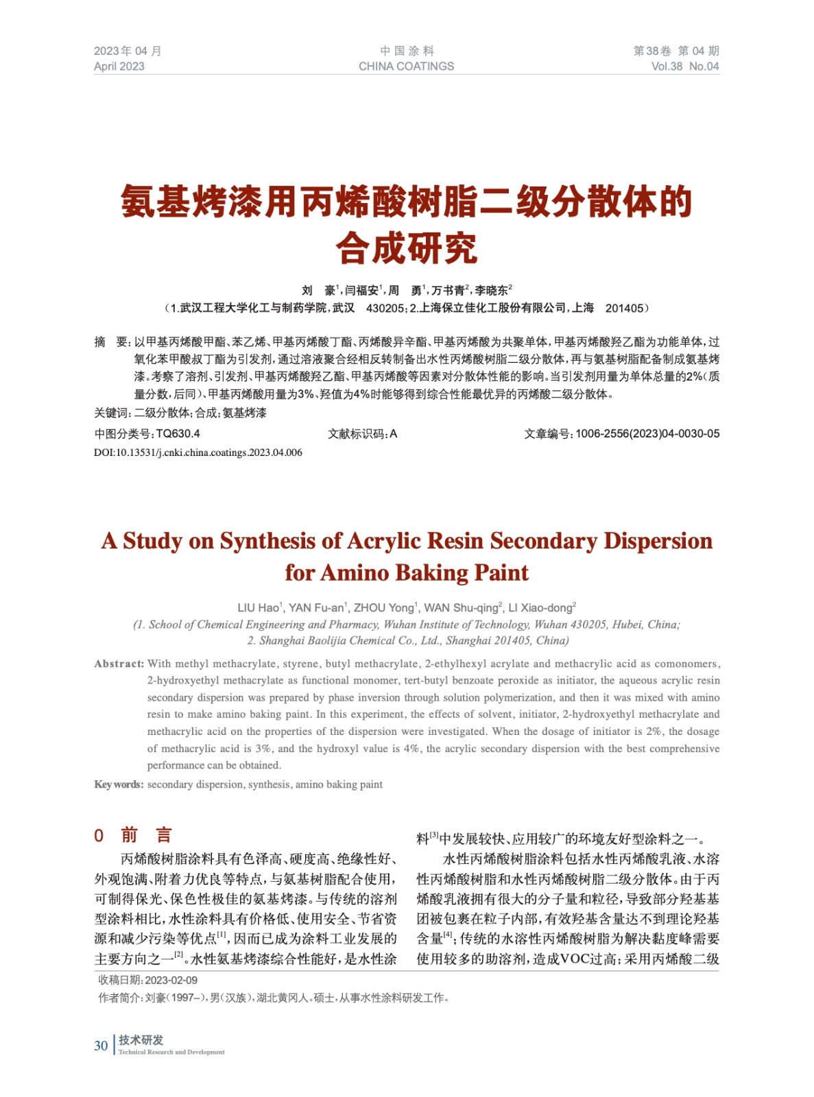 氨基烤漆用丙烯酸樹脂二級分散體的合成研究