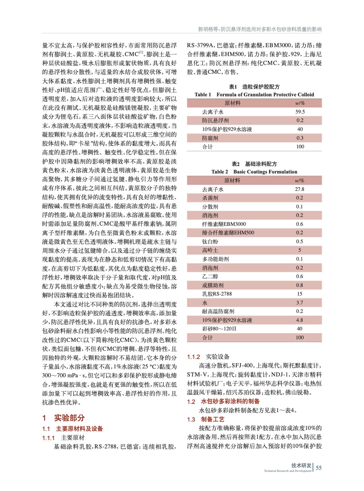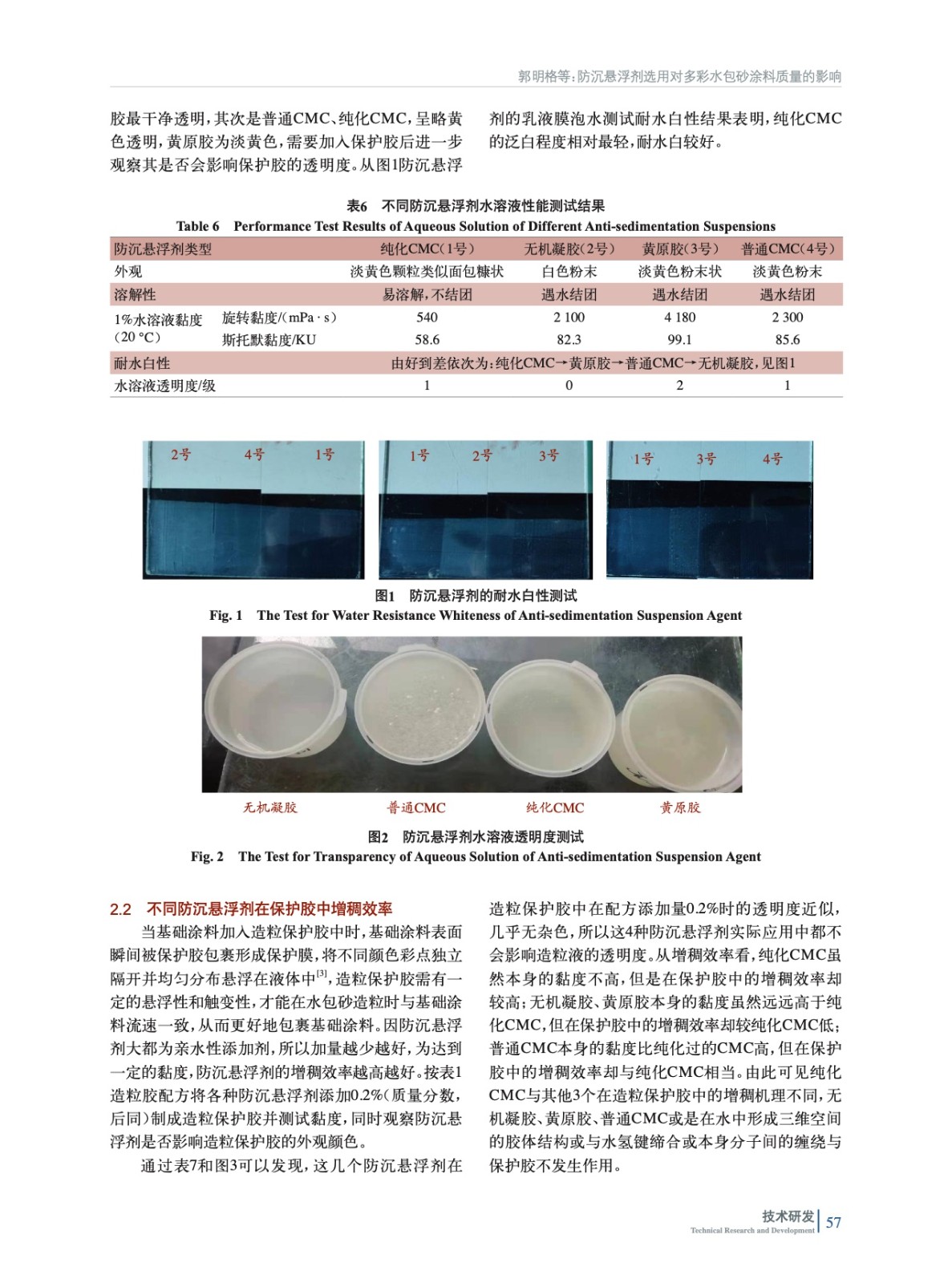 通過測試不同種類的防沉懸浮劑水溶液的耐水白性、防沉懸浮劑在造粒保護膠中的增稠效果、基礎涂料尤其是深色基礎涂料加入造粒保護膠后的抗滲色性及防沉懸浮性、成品涂料的加速貯存穩定性等,優選出了純化改性CMC作為水包砂多彩涂料的助劑時,產品的防沉劑懸浮性最優。