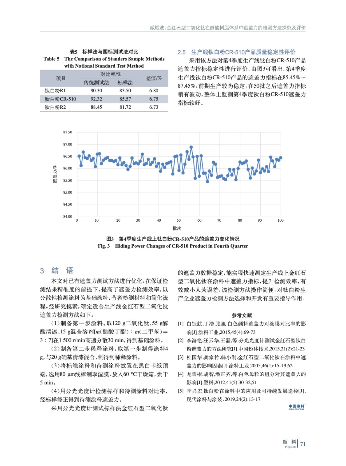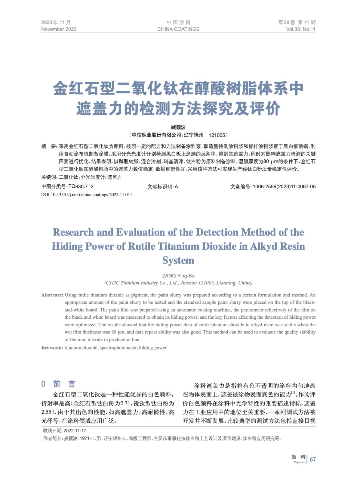 摘要:采用金紅石型二氧化鈦為顏料,按照一定的配方和方法制備涂料漿,取適量待測(cè)涂料漿和標(biāo)樣涂料漿置于黑白板頂端,利用自動(dòng)涂布機(jī)制備涂膜,采用分光光度計(jì)分別檢測(cè)黑白板上涂膜的反射率,得到其遮蓋力,同時(shí)對(duì)影響遮蓋力檢測(cè)的關(guān)鍵因素進(jìn)行優(yōu)化。結(jié)果表明,以醇酸樹(shù)脂、混合溶劑、硝基清漆、鈦白粉為原料制備涂料,濕膜厚度為80 μm的條件下,金紅石型二氧化鈦在醇酸樹(shù)脂中的遮蓋力數(shù)值穩(wěn)定,數(shù)據(jù)重塑性好。采用該種方法可實(shí)現(xiàn)生產(chǎn)線(xiàn)鈦白粉質(zhì)量穩(wěn)定性評(píng)價(jià)。