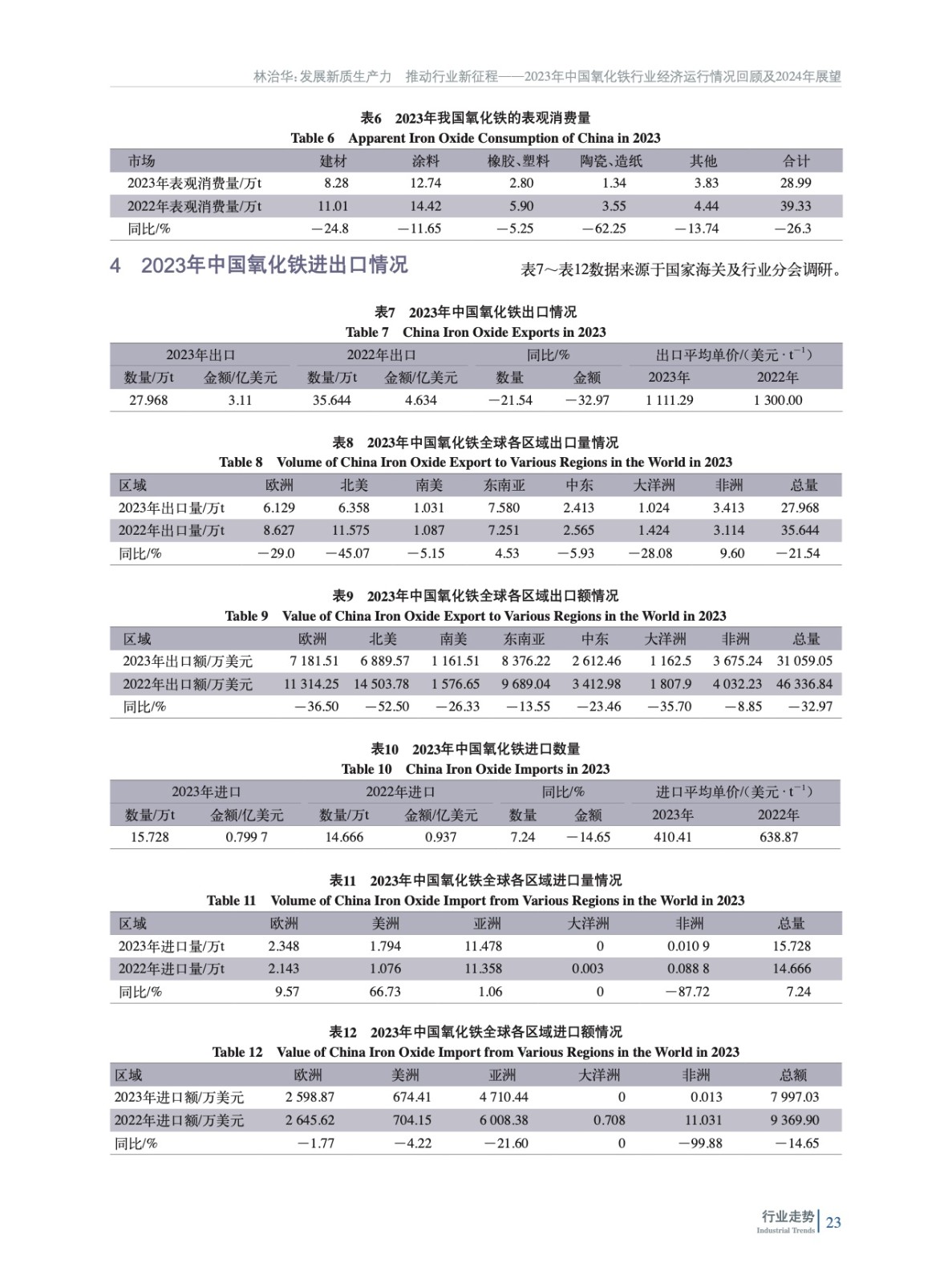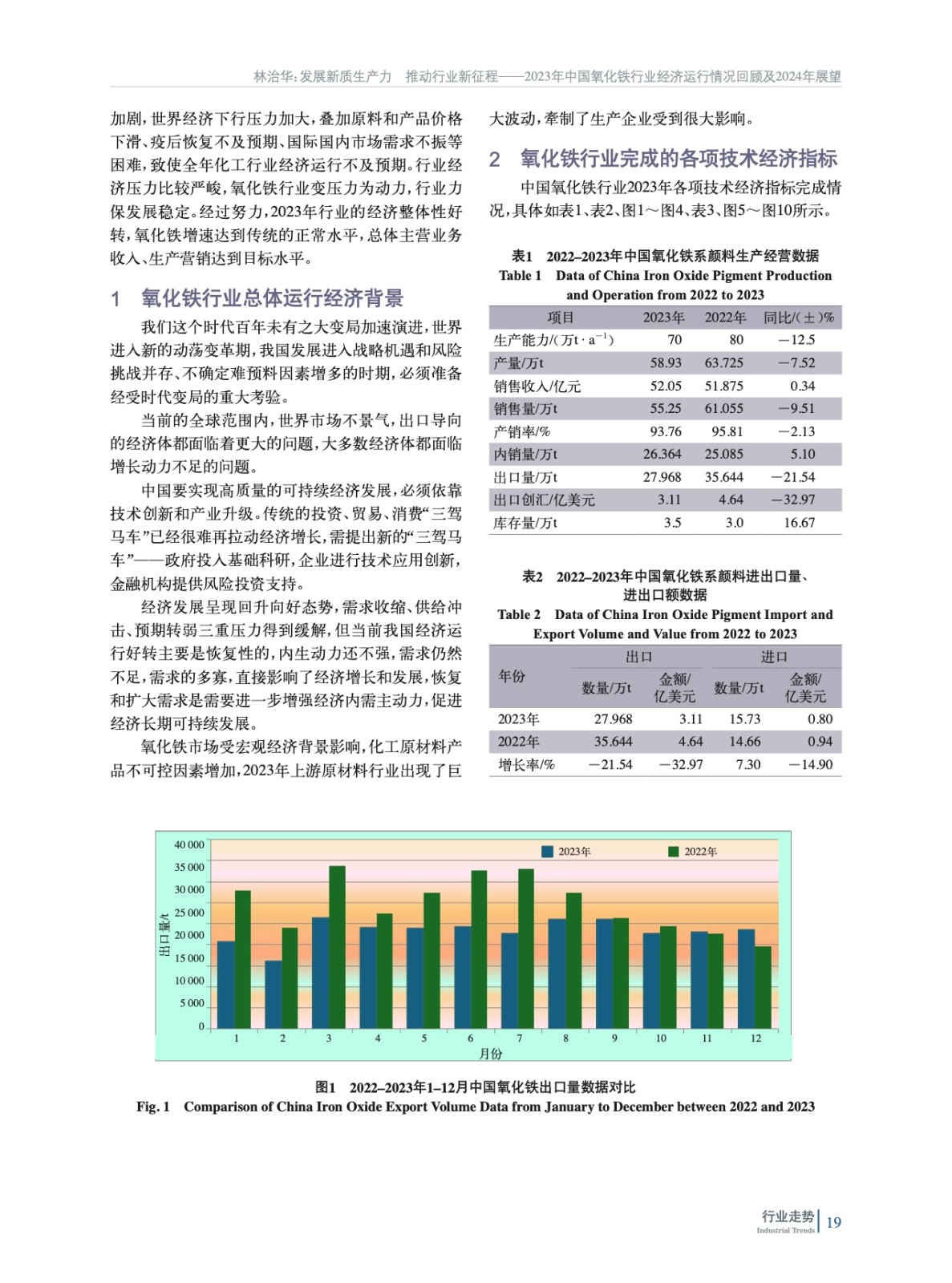 綜述了2023年中國氧化鐵行業所處的經濟環境,梳理了各項技術經濟指標完成情況、生產營銷情況,并對行業進出口數據進行了分析,回顧了氧化鐵行業2023年整體運行情況,并對2024年發展方向進行了展望。