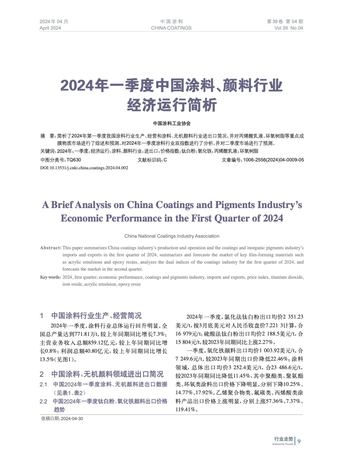 2024年一季度中國涂料、顏料行業經濟運行簡析