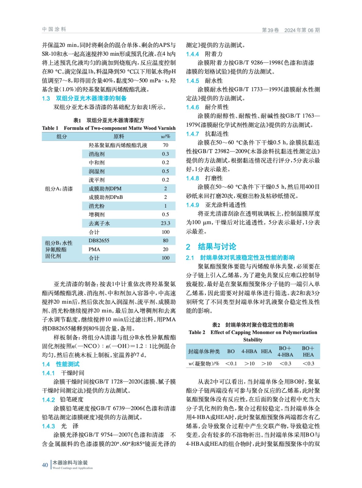 摘要:以聚己二酸新戊二醇酯(PNA1000)、六亞甲基二異氰酸酯(HDI)、聚醚二元醇磺酸鹽(SPPG)、正丁醇(BO)和4–丙烯酸羥丁酯(4-HBA)為原料合成端乙烯基封端的聚氨酯預聚體,再以甲基丙烯酸甲酯(MMA)、丙烯酸正丁酯(BA)、丙烯酸羥乙酯(HEA)、丙烯酸(AA)為聚合單體,通過預乳化種子乳液聚合法合成了一種羥基聚氨酯丙烯酸酯乳液,研究了封端單體種類、聚氨酯質量分數、羥基含量對乳液穩(wěn)定性和性能的影響。結果表明,使用BO和4-HBA作為封端單體、聚氨酯質量分數為30%、羥基含量為1.0%(基于固含量),乳液合成穩(wěn)定且性能優(yōu)異,用其配制的水性雙組分木器涂料,附著力好、抗黏連性好、耐水和耐化學品性優(yōu)異。