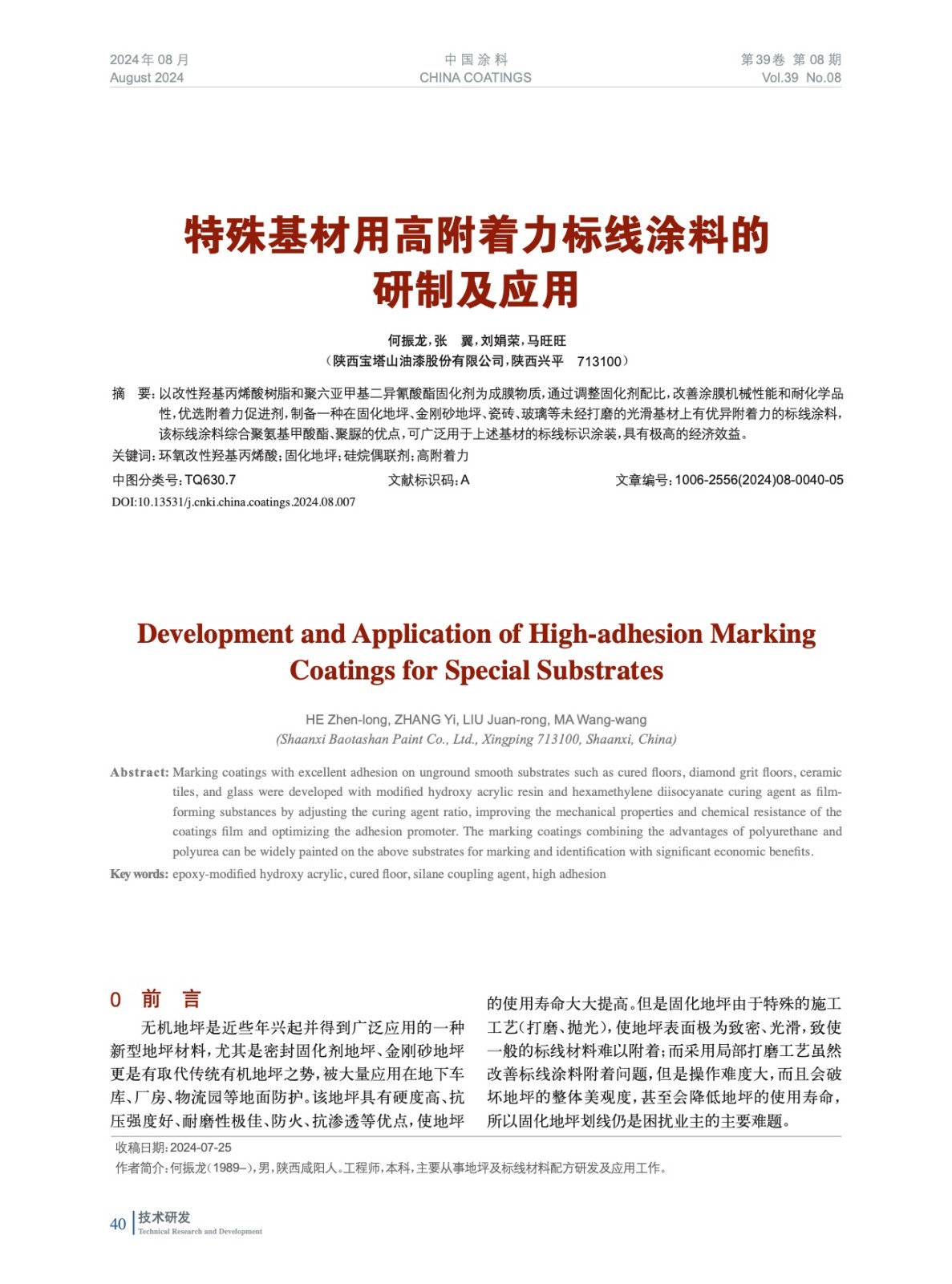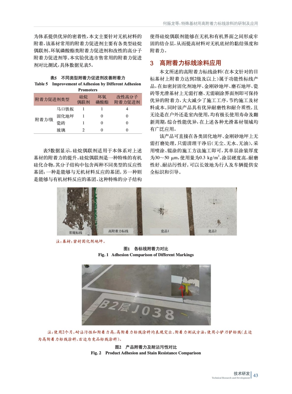 摘要:以改性羥基丙烯酸樹脂和聚六亞甲基二異氰酸酯固化劑為成膜物質,通過調整固化劑配比,改善涂膜機械性能和耐化學品性,優選附著力促進劑,制備一種在固化地坪、金剛砂地坪、瓷磚、玻璃等未經打磨的光滑基材上有優異附著力的標線涂料,該標線涂料綜合聚氨基甲酸酯、聚脲的優點,可廣泛用于上述基材的標線標識涂裝,具有極高的經濟效益。