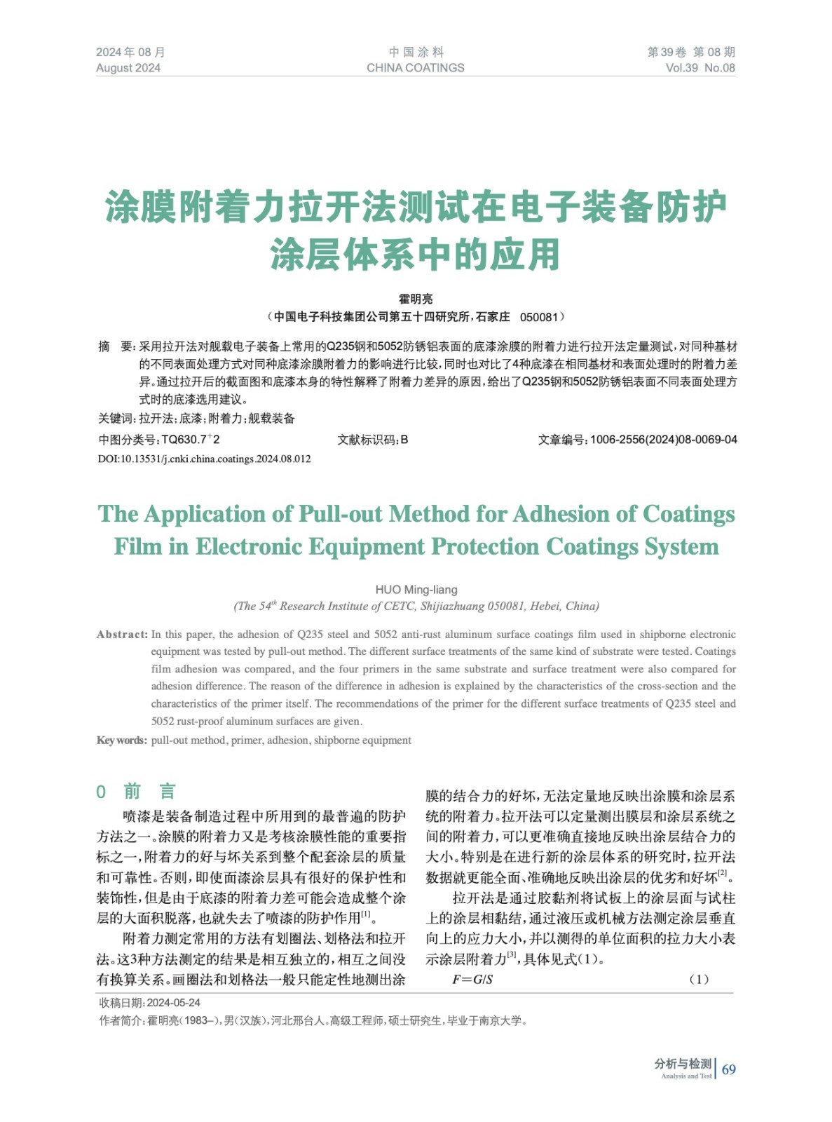 摘要:采用拉開法對艦載電子裝備上常用的Q235鋼和5052防銹鋁表面的底漆涂膜的附著力進行拉開法定量測試,對同種基材的不同表面處理方式對同種底漆涂膜附著力的影響進行比較,同時也對比了4種底漆在相同基材和表面處理時的附著力差異。通過拉開后的截面圖和底漆本身的特性解釋了附著力差異的原因,給出了Q235鋼和5052防銹鋁表面不同表面處理方式時的底漆選用建議。