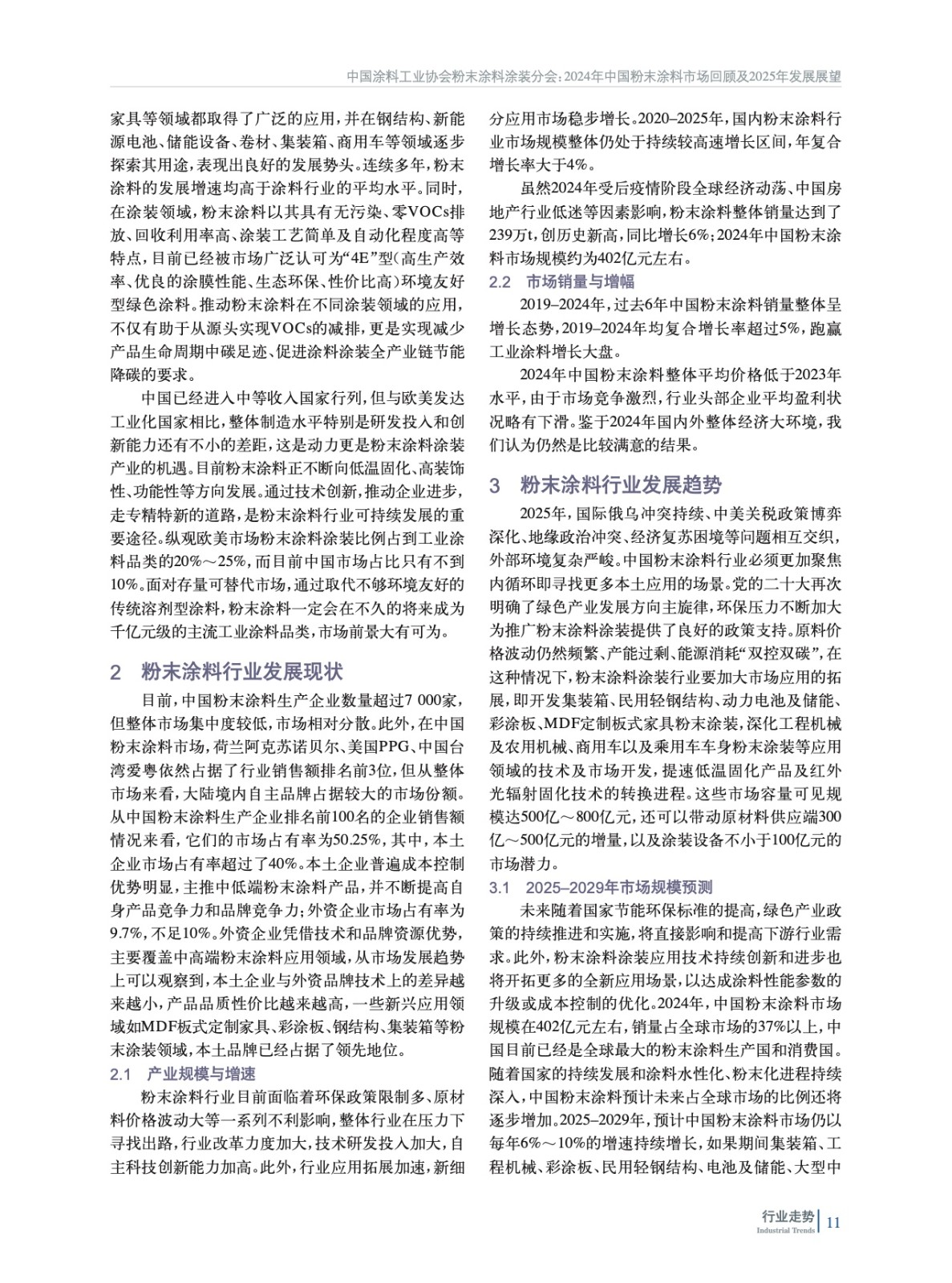 綜述了中國粉末涂料行業發展背景和動力、當前行業發展現狀,對2025–2029年粉末涂料市場規模、行業發展機遇和面臨的挑戰以及發展趨勢進行了預測,并對近年來粉末涂料行業相關政策、標準進行了總結。