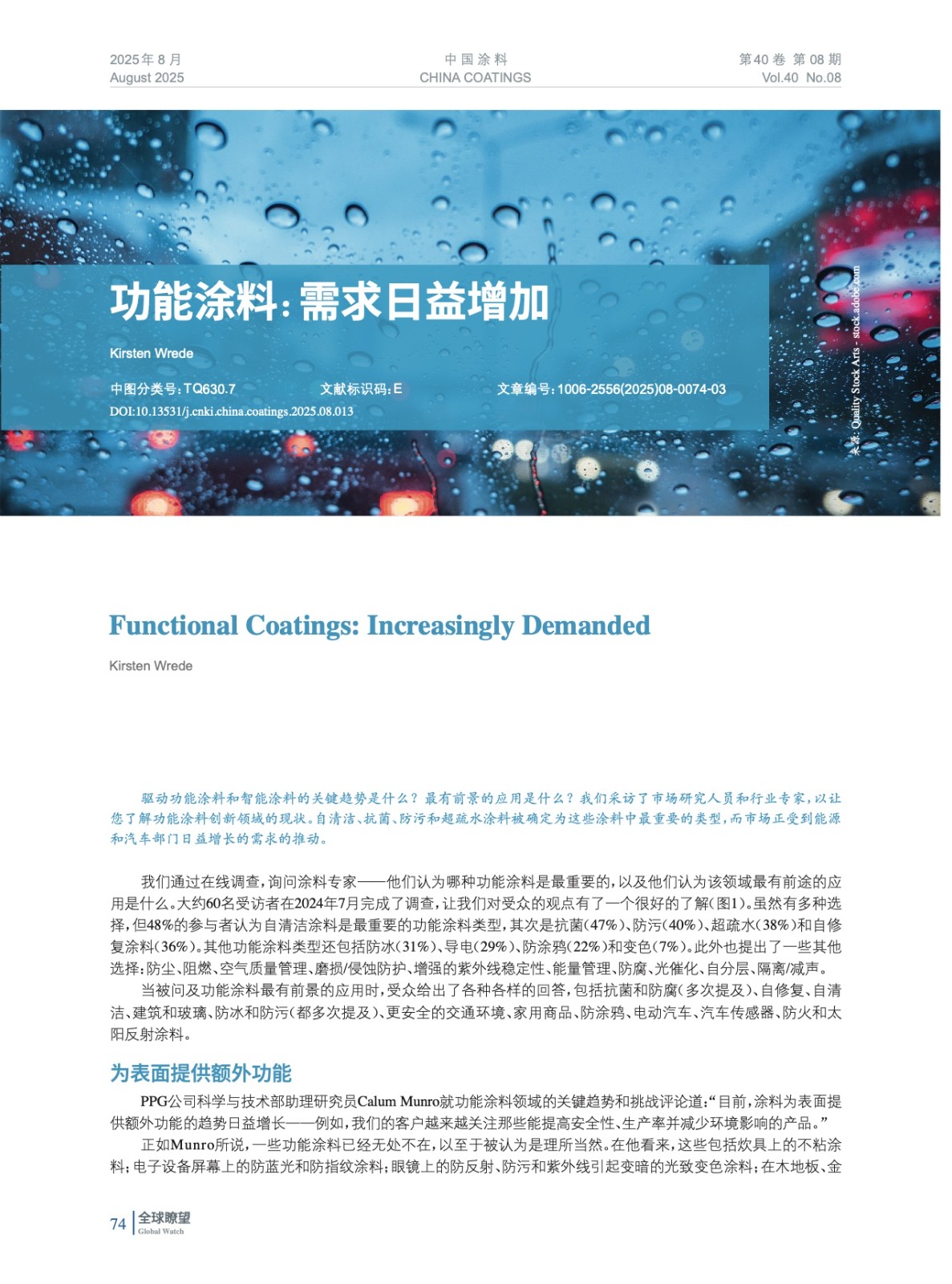編者按:驅動功能涂料和智能涂料的關鍵趨勢是什么?最有前景的應用是什么?我們采訪了市場研究人員和行業專家,以讓您了解功能涂料創新領域的現狀。自清潔、抗菌、防污和超疏水涂料被確定為這些涂料中最重要的類型,而市場正受到能源和汽車部門日益增長的需求的推動。