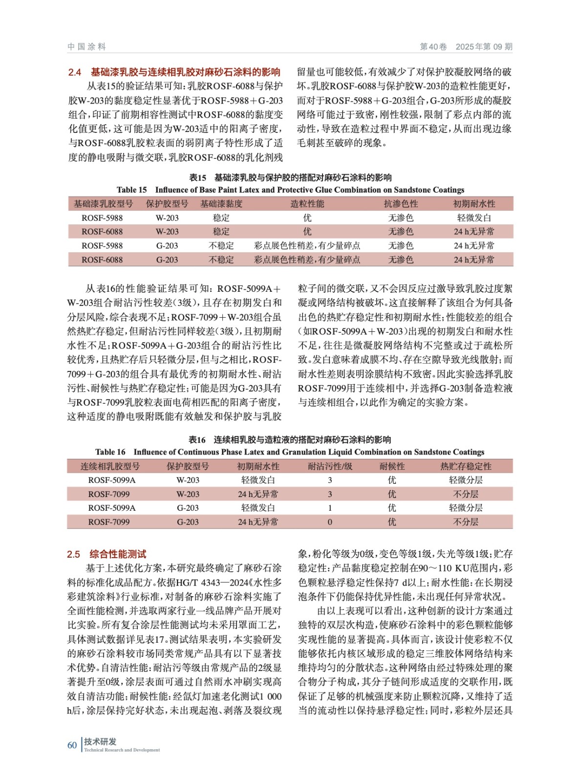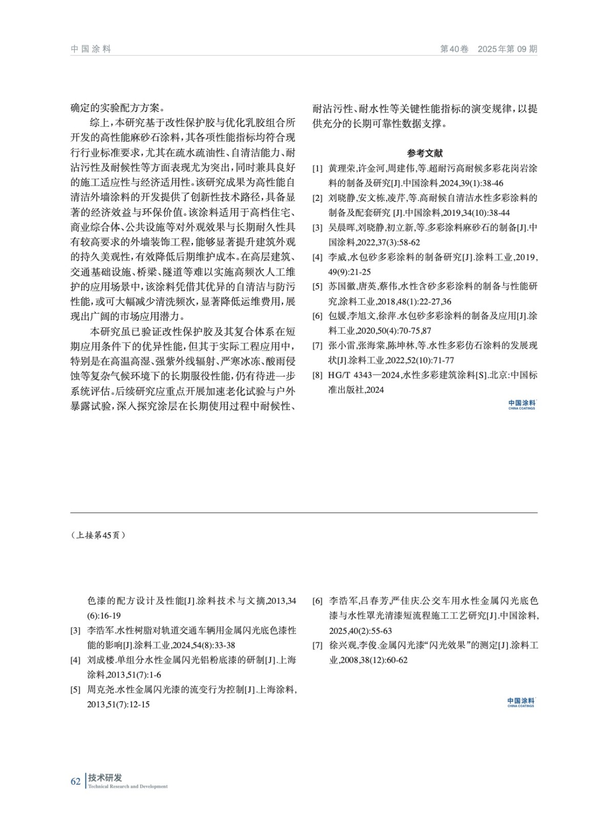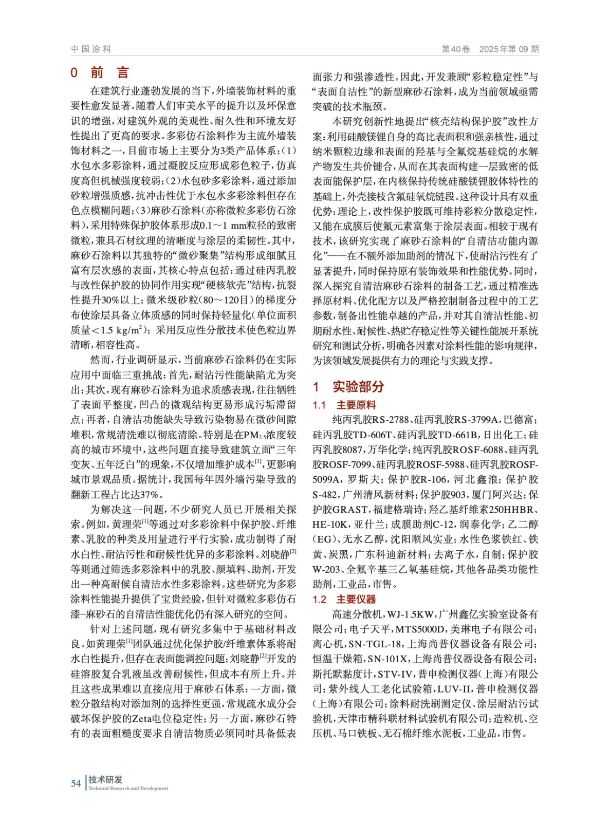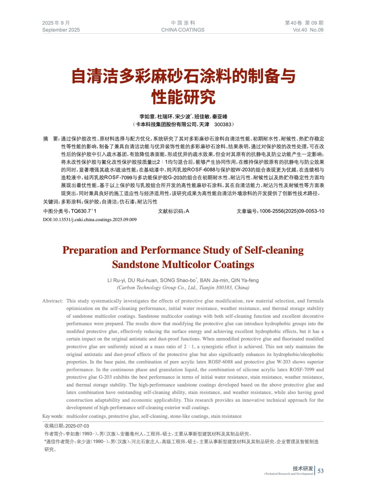 摘要:通過(guò)保護(hù)膠改性、原材料選擇與配方優(yōu)化,系統(tǒng)研究了其對(duì)多彩麻砂石涂料自清潔性能、初期耐水性、耐候性、熱貯存穩(wěn)定性等性能的影響,制備了兼具自清潔功能與優(yōu)異裝飾性能的多彩麻砂石涂料。結(jié)果表明,通過(guò)對(duì)保護(hù)膠的改性處理,可在改性后的保護(hù)膠中引入疏水基團(tuán),有效降低表面能,形成優(yōu)異的疏水效果,但會(huì)對(duì)其原有的抗靜電及防塵功能產(chǎn)生一定影響;將未改性保護(hù)膠與氟化改性保護(hù)膠按質(zhì)量比2∶1均勻混合后,能夠產(chǎn)生協(xié)同作用,在維持保護(hù)膠原有的抗靜電與防塵效果的同時(shí),顯著增強(qiáng)其疏水/疏油性能;在基礎(chǔ)漆中,純丙乳膠ROSF-6088與保護(hù)膠W-203的組合表現(xiàn)更為優(yōu)越,在連續(xù)相與造粒液中,硅丙乳膠ROSF-7099與多功能保護(hù)膠G-203的組合在初期耐水性、耐沾污性、耐候性以及熱貯存穩(wěn)定性方面均展現(xiàn)出最優(yōu)性能。基于以上保護(hù)膠與乳膠組合所開發(fā)的高性能麻砂石涂料,其在自清潔能力、耐沾污性及耐候性等方面表現(xiàn)突出,同時(shí)兼具良好的施工適應(yīng)性與經(jīng)濟(jì)適用性,該研究成果為高性能自清潔外墻涂料的開發(fā)提供了創(chuàng)新性技術(shù)路徑。
