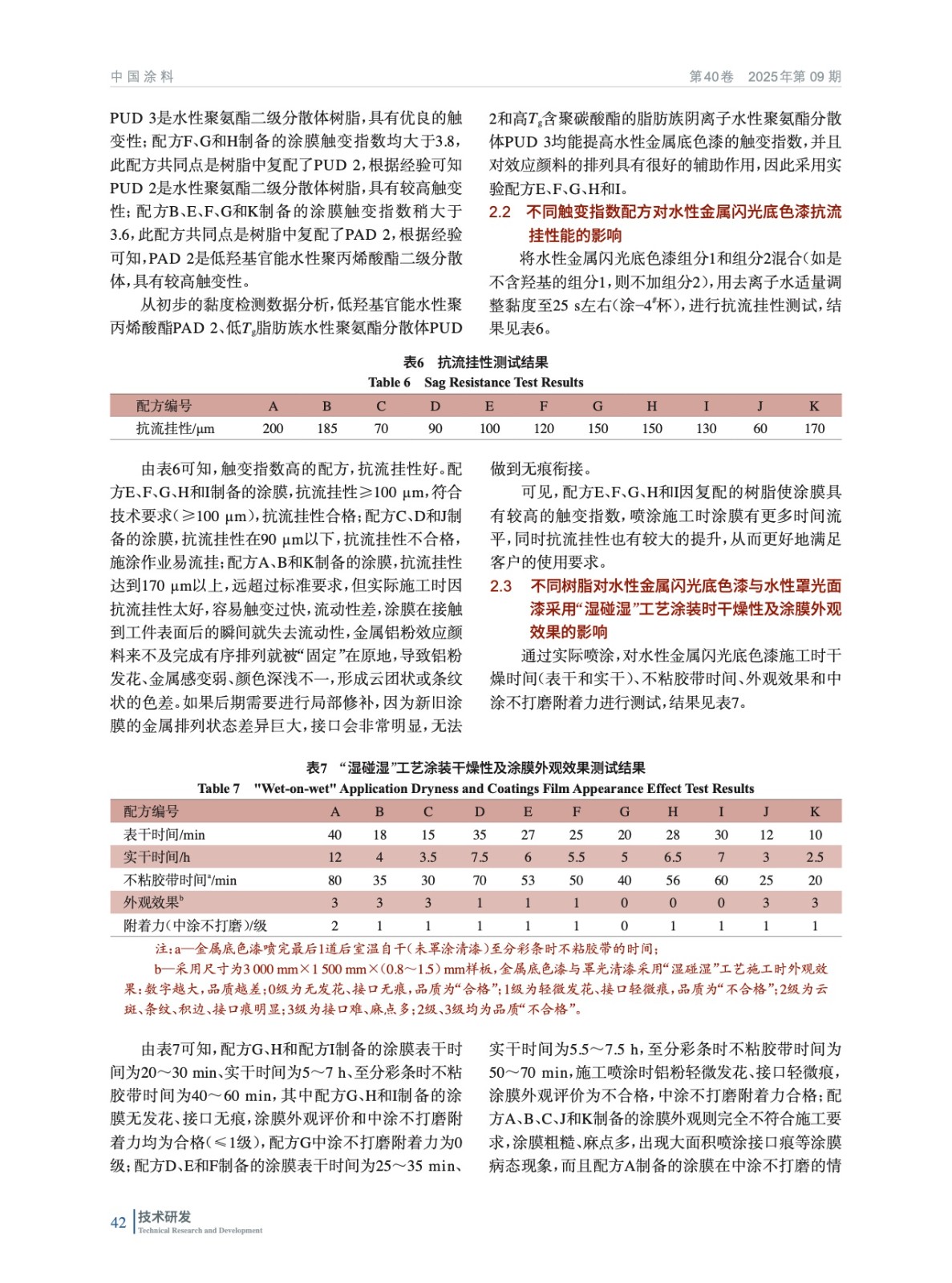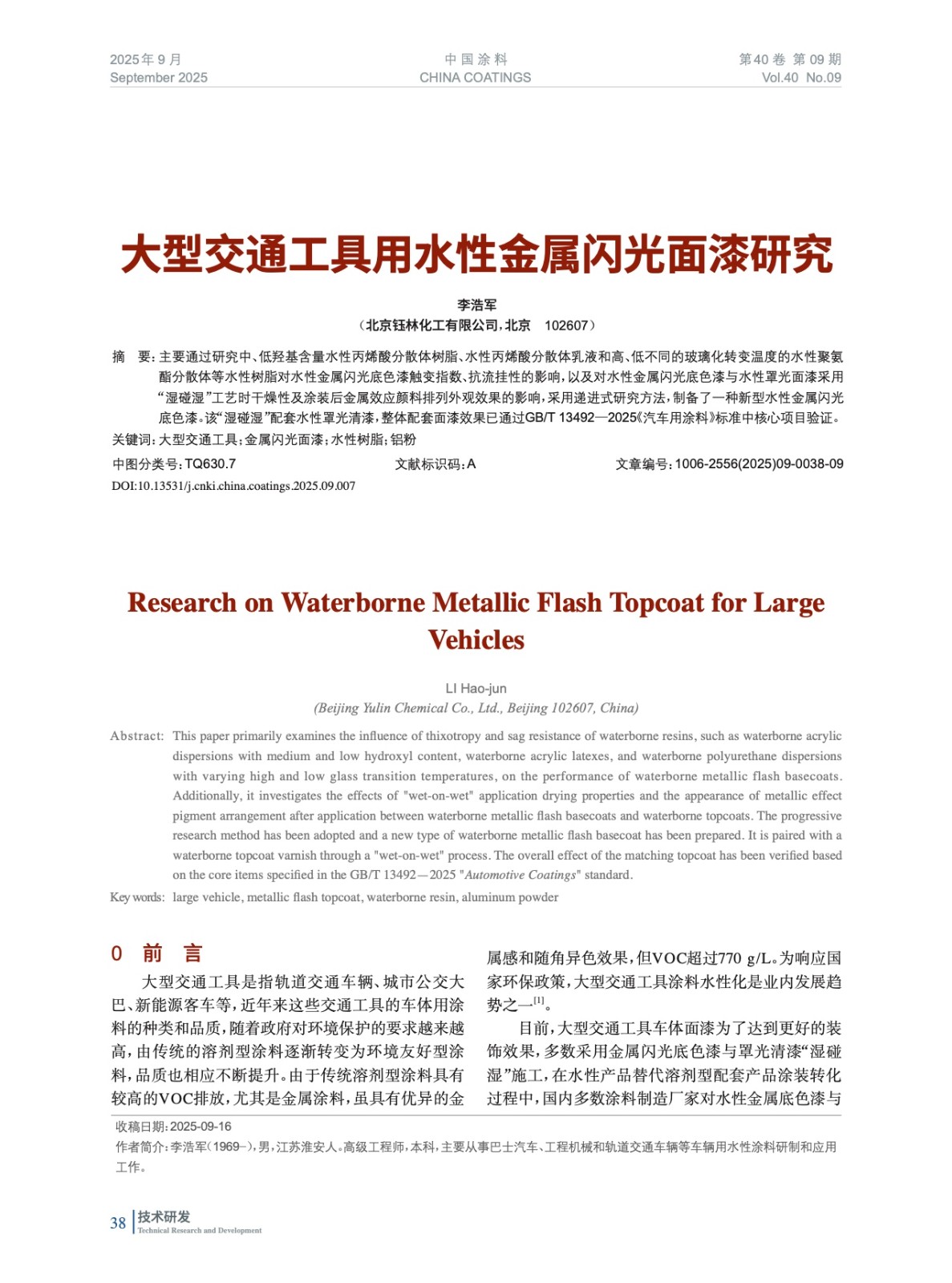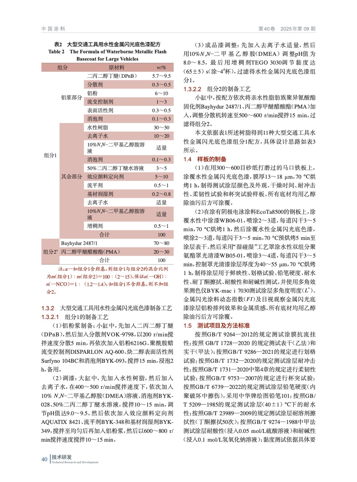 摘要:主要通過研究中、低羥基含量水性丙烯酸分散體樹脂、水性丙烯酸分散體乳液和高、低不同的玻璃化轉變溫度的水性聚氨酯分散體等水性樹脂對水性金屬閃光底色漆觸變指數、抗流掛性的影響,以及對水性金屬閃光底色漆與水性罩光面漆采用“濕碰濕”工藝時干燥性及涂裝后金屬效應顏料排列外觀效果的影響,采用遞進式研究方法,制備了一種新型水性金屬閃光底色漆。該“濕碰濕”配套水性罩光清漆,整體配套面漆效果已通過GB/T 13492—2025《汽車用涂料》標準中核心項目驗證。