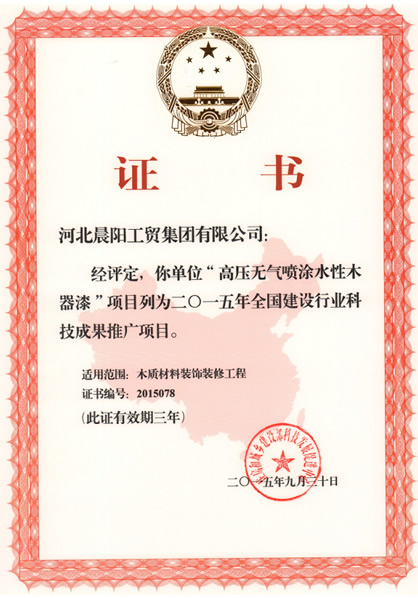 近日,由晨陽(yáng)水漆研發(fā)生產(chǎn)的“高壓無(wú)氣噴涂水性木器漆”被列入2015年全國(guó)建設(shè)行業(yè)科技成果推廣項(xiàng)目。截至目前,該公司已有3項(xiàng)科技成果榮獲“全國(guó)建設(shè)行業(yè)科技成果推廣項(xiàng)目”證書(shū)。