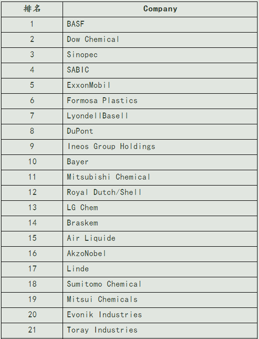 在今年的榜單中排名第二至第十的分別是陶氏化學、中石化、SABIC、埃克森美孚、臺塑、利安德巴賽爾、杜邦、英力士和拜耳。排名與去年變化不大,只有德國拜耳公司從去年的第十一名上升至今年的第十名。