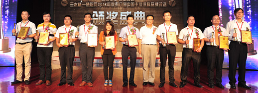 7月17日,由慧聰涂料網主辦的“百家爭鳴,思想博弈” 涂料高峰論壇暨 2013年度第八屆中國十佳涂料品牌評選頒獎盛典在慧聰網集團總部慧聰園盛大開幕。眾多涂企代表與來自全國各地涂料行業產業鏈上下游的廠商代表、行業領導、專家約400余人和幾十家業內媒體出席了此次盛典。展辰家具漆從業內參加評選的近1500家優秀企業中脫穎而出,榮獲“十佳家具漆品牌”殊榮。