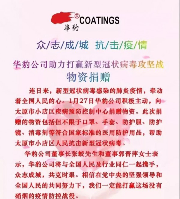 1月27日華豹公司積極主動,向太原市小店區疾病預防控制中心捐贈物資。此次捐贈的物資包括但不限于口罩、手套、防護服、防護鏡、消毒劑等符合國家標準的醫用防護用品,幫助太原市小店區人民抗擊新型冠狀病毒。