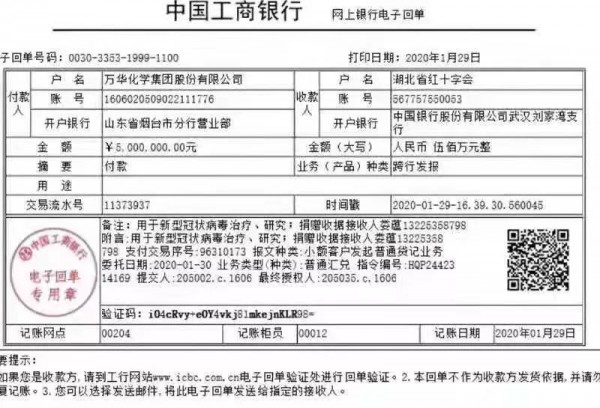 1)向湖北紅十字會捐款現(xiàn)金500萬元人民幣,用于新型冠狀病毒治療研究,醫(yī)療、防護設施購置,保障醫(yī)護人員安全和病人救治。