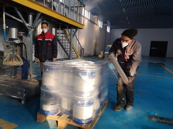 此時,員工何海山開著叉車過來了,正準備將剩下的一包防火涂料裝上車。“每包涂料22桶,都是工人們加班加點生產出來的。”何海山心里有數,他已往車上裝了14包。