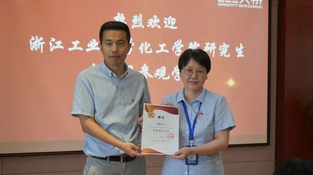 聘任浙江大橋黨委副書記傅震紅為浙江工業(yè)大學(xué)化工學(xué)院黨建理論導(dǎo)師,由浙江工業(yè)大學(xué)化工學(xué)院劉軍磊老師頒發(fā)聘書。