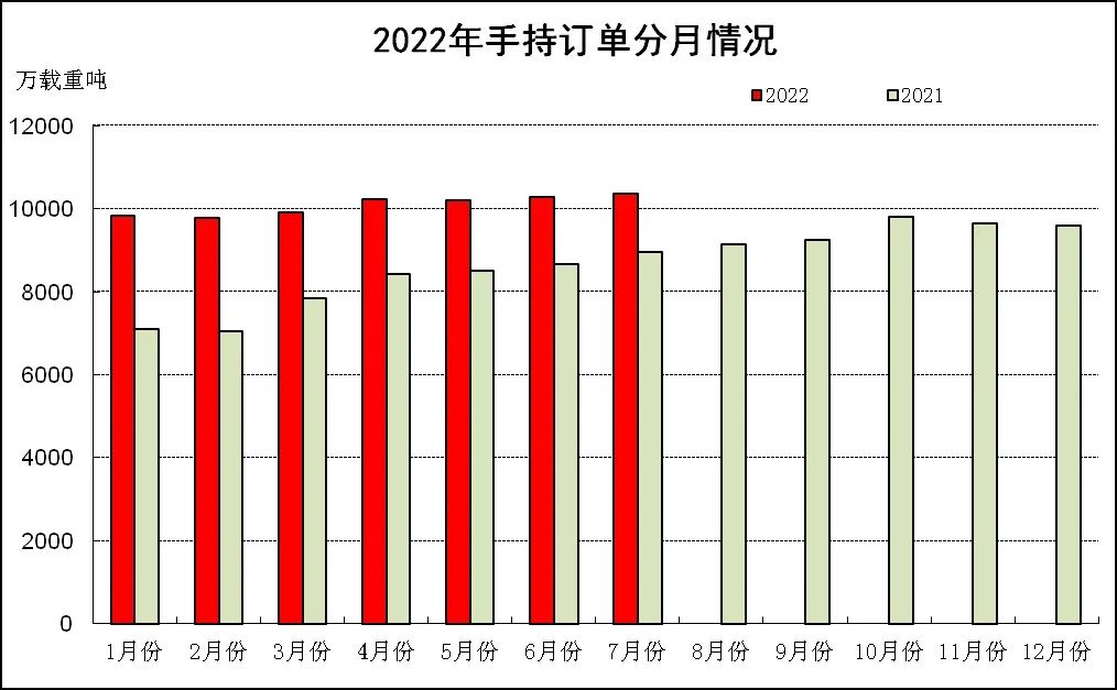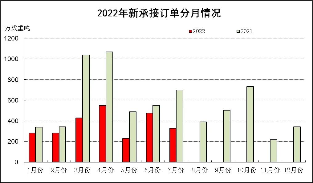 1~7月,50家重點(diǎn)監(jiān)測(cè)造船企業(yè)造船完工1995萬(wàn)載重噸,同比下降15.5%。承接新船訂單2412萬(wàn)載重噸,同比下降45.0%。7月底,手持船舶訂單10041萬(wàn)載重噸,同比增長(zhǎng)14.3%。