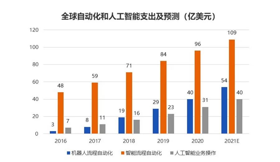 隨著全球自動化和人工智能等技術的發展,全球企業紛紛加大力度布局自動化和智能制造領域。根據艾媒咨詢對智能制造相關領域支出的統計,近年來,機器人流程自動化、智能流程自動化和人工智能業務操作這三個方面都保持了持續增長,其中機器人流程自動化增長的最快,它的年均增速達到了30%以上,這代表了“機器換人”已成為工業生產的一大趨勢。