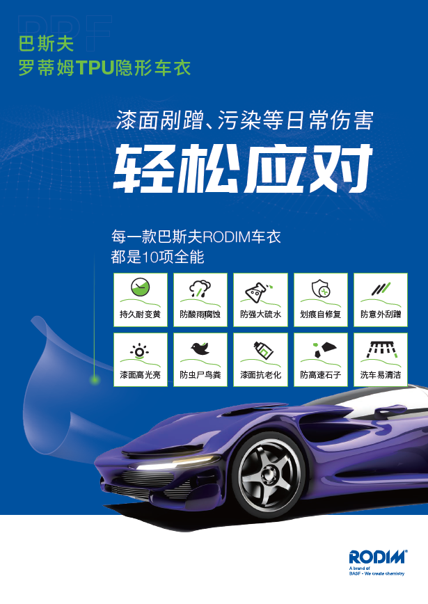 RODIM羅蒂姆車衣是巴斯夫快速響應(yīng)中國(guó)客戶日益提升的產(chǎn)品、服務(wù)需求、擴(kuò)大巴斯夫在汽車市場(chǎng)戰(zhàn)略性產(chǎn)品品類的重要舉措,是巴斯夫更好服務(wù)汽車后市場(chǎng)的新的嘗試。