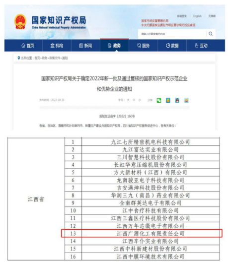 近日,江西廣源化工有限責任公司成功上榜“國家知識產權優勢企業”,這標志著公司在知識產權工作邁上更高的臺階。