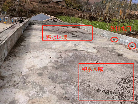 在考察的過程中,韓工發現小學是老舊屋面,大面積分布著龜裂紋,同時存在較大裂縫,漏水較為嚴重。整個屋面無找坡層,平整度較差,低洼處存在嚴重的積水現象,且落口管口全部被雜物堵死。