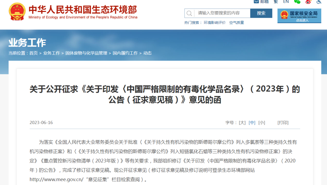 政策|生態(tài)環(huán)境部公開征求《中國嚴格限制的有毒化學品名錄》(2023年)(征求意見稿)意見