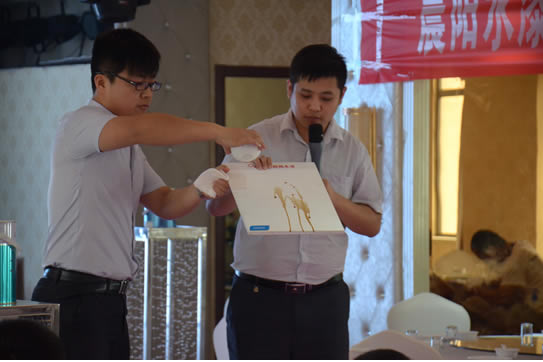 當(dāng)天,還舉行了晨陽水漆產(chǎn)品推廣會(huì)。晨陽水漆培訓(xùn)部員工介紹了公司的歷史背景、水漆未來的發(fā)展趨勢、國家相關(guān)扶持政策和2015年品牌發(fā)展方向。現(xiàn)場,通過產(chǎn)品試刷和養(yǎng)金魚試驗(yàn),油工師傅們對晨陽水漆產(chǎn)品環(huán)保特性和施工效果表示肯定。