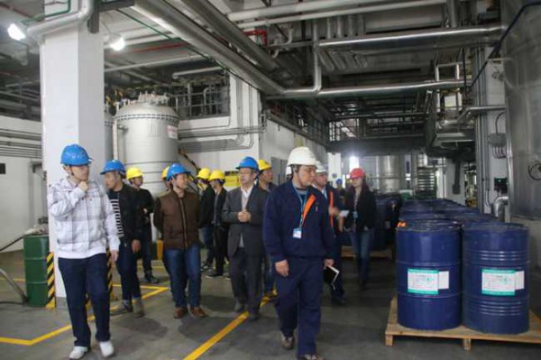 參觀的醇酸和聚酯合成釜是容量25m3,采用釜外兌稀,一釜可生產(chǎn)40多噸固體分50%的醇酸或聚酯樹脂,體現(xiàn)了規(guī)模化生產(chǎn),提高生產(chǎn)效率,且產(chǎn)品質(zhì)量穩(wěn)定。